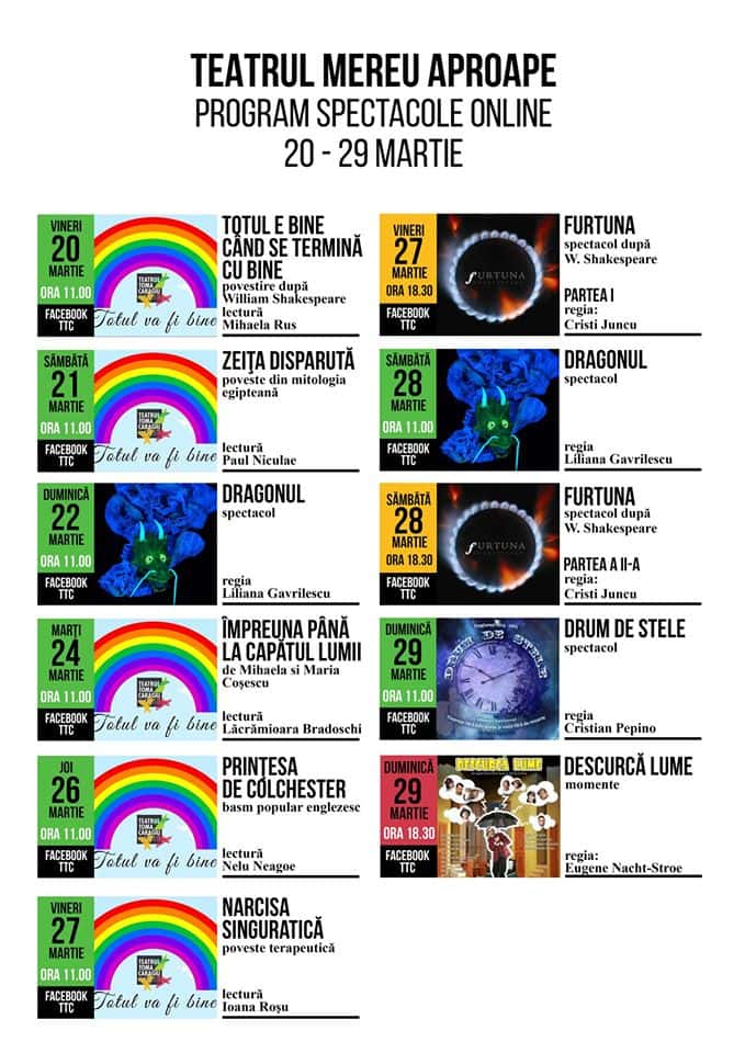 Spectacolele vor putea fi vizionate pe pagina oficială de Facebook a Teatrului Ploieşti, link AICI.