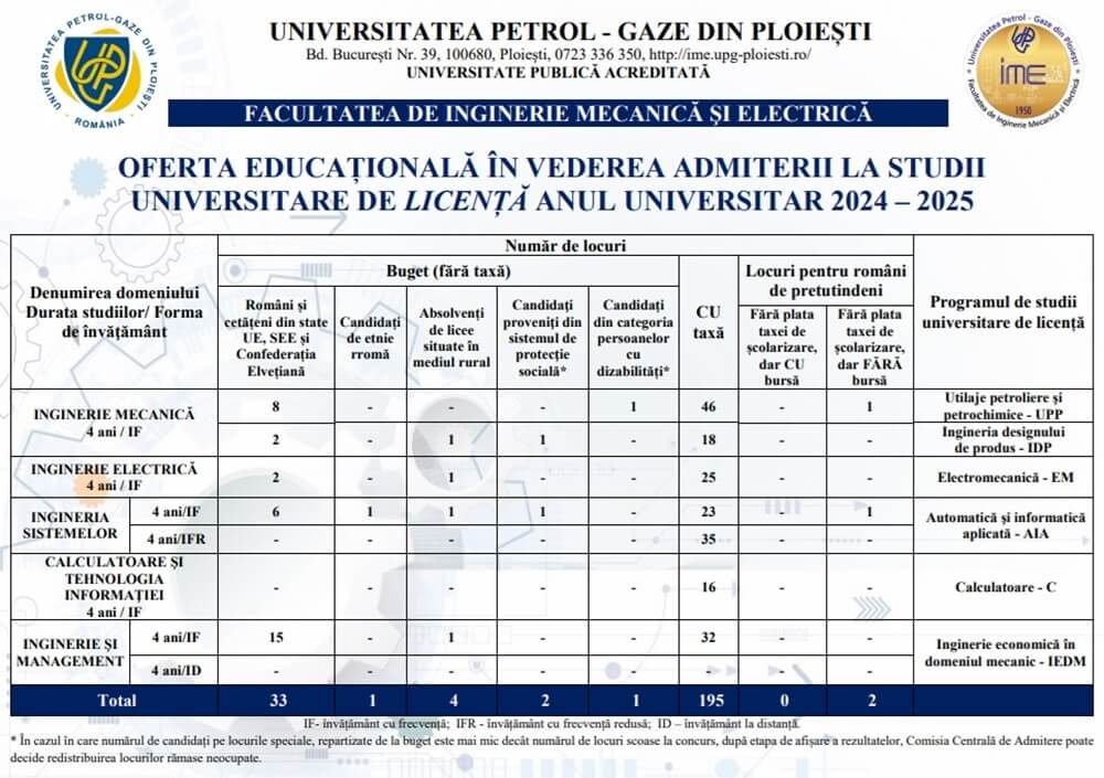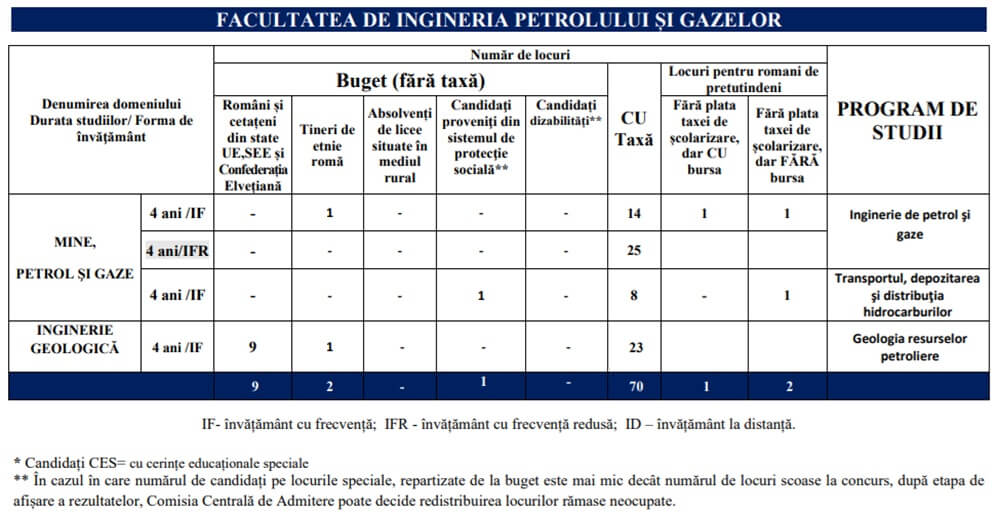 Oferta de școlarizare - studii de licență Facultatea de Ingineria Petrolului și a Gazelor (sesiunea septembrie 2024)