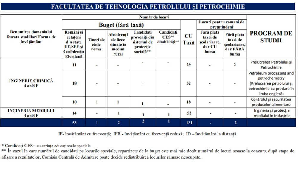 Oferta de școlarizare - studii de licență Facultatea de Tehnologia Petrolului și Petrochimie (sesiunea septembrie 2024)