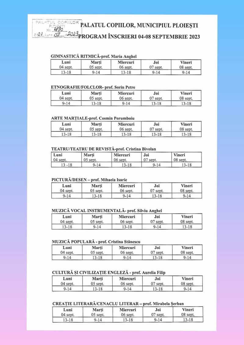 La cursuri pot lua parte copii și tineri cu vârste cuprinse între 4 și 19 ani. Cererile de înscriere și în vederea reînscrierii pot fi completate și depuse până vineri, pe 8 septembrie, la sediul nostru din Ploiești, Str. Mărășești nr. 239, conform programului de înscriere afișat.
