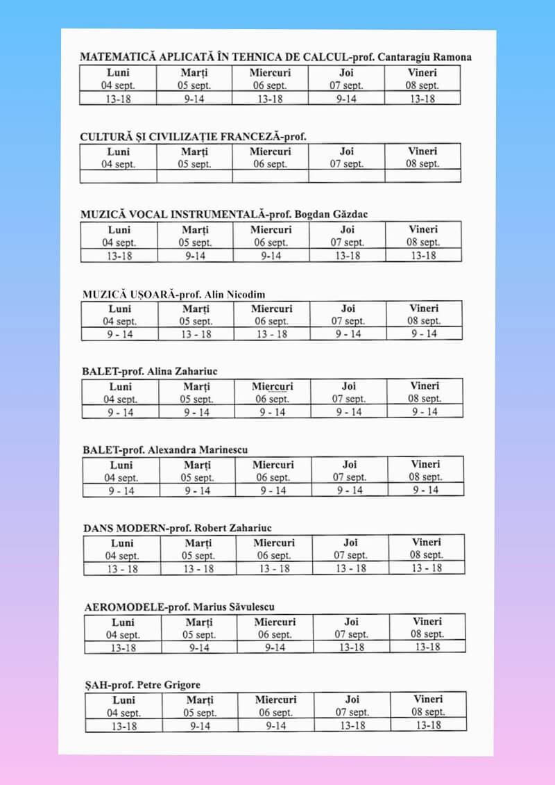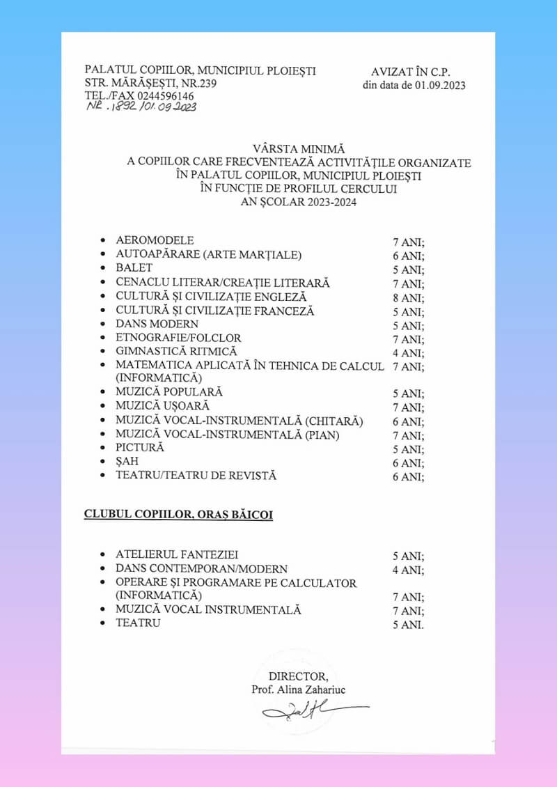 Palatul Copiilor - lista cursurilor organizate în anul școlar 2023 - 2024