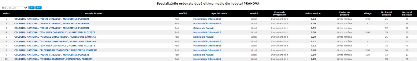 Între primele 10 se mai regăsesc specializări de la CNILC Ploiești (media ultimul admis în liceu - 7,95), CN "Nichita Stănescu" Ploiești (media ultimul admis în liceu - 8,67), CN "Al. I. Cuza" Ploiești (media ultimul admis în liceu - 6,82) și CN "Nicolae Grigorescu" Câmpina (media ultimul admis în liceu - 8,40):
