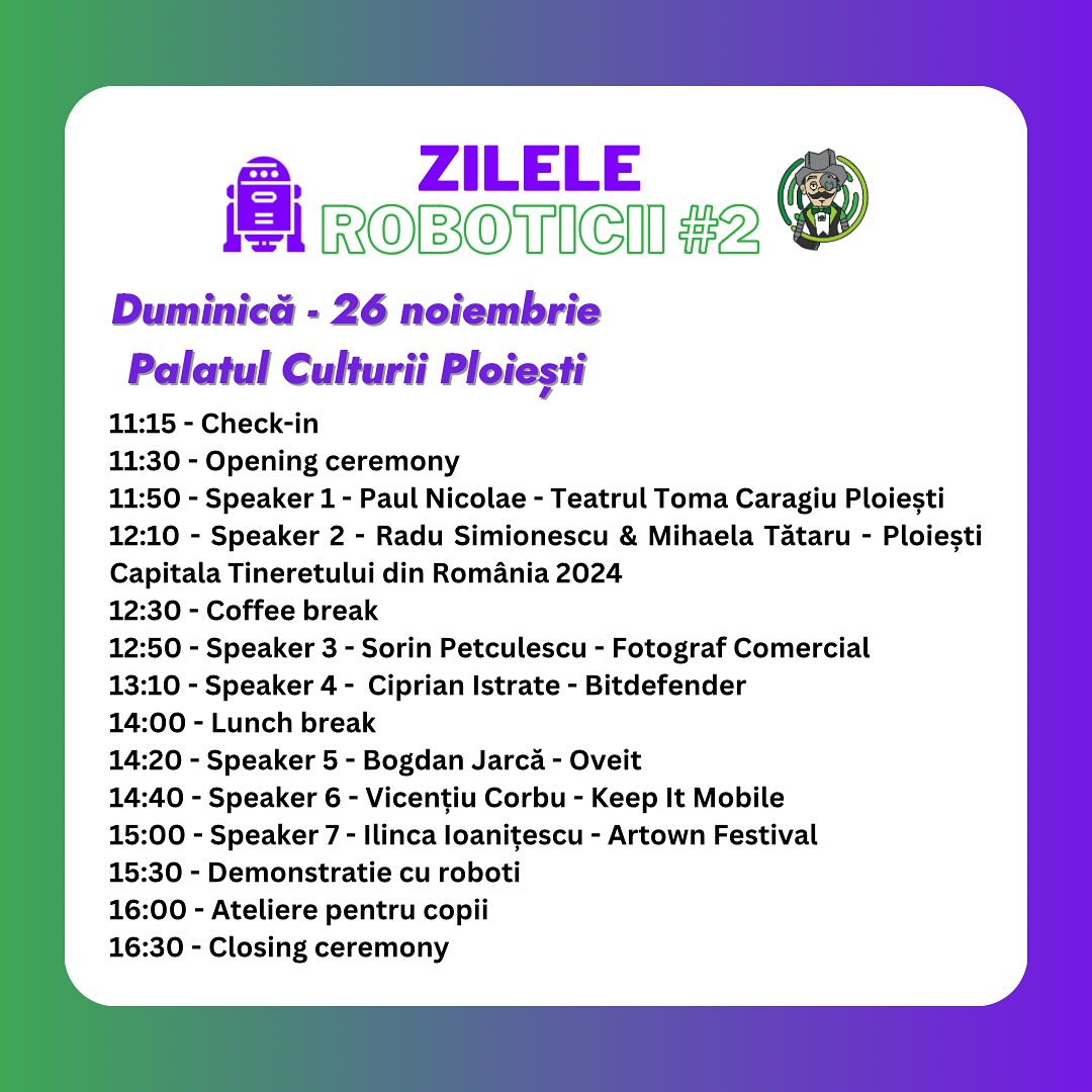 Evenimentul continuă duminică, de la ora 11.00, la Palatul Culturii din Ploiești. Sala Marea Unire va găzdui meciuri demonstrative între roboți, iar pentru cei mai mici dintre participanți vor fi organizate ateliere special concepute pentru a le stimula creativitatea și curiozitatea. Tot duminică sunt programate conferințe susținute de opt speakeri de top din domeniile S.T.E.A.M. (Știință, Tehnologie, Inginerie, Arte și Matematică). Pentru pasionați, evenimentul de la Ploiești este un bun prilej de a-i întâlni și aculta, printre alții, pe Bogdan Jarcă - Success Manager Oveit și Vicențiu Corbu - fondator și CEO KIM, cărora li se vor alătura Mihaela Tătaru și Radu Simionescu - manageri de proiect "Ploiești #Lets PLAY - Capitala Tineretului din România 2024".