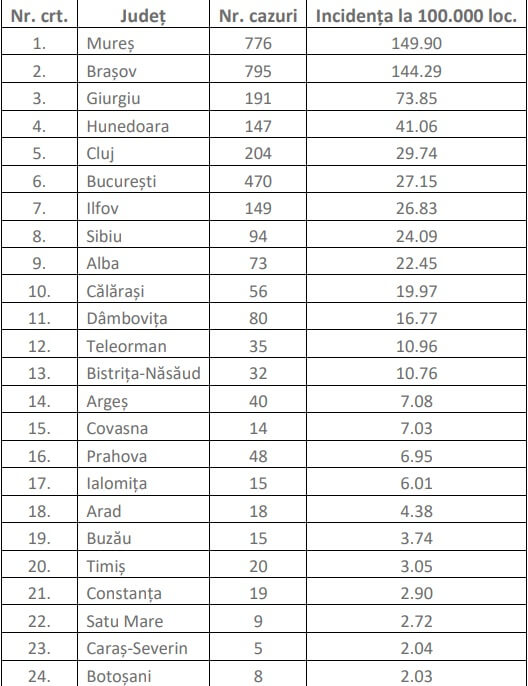 Cele 3353 de cazuri confirmate cu rujeolă au fost raportate în 35 de județe și în Municipiul București, astfel: