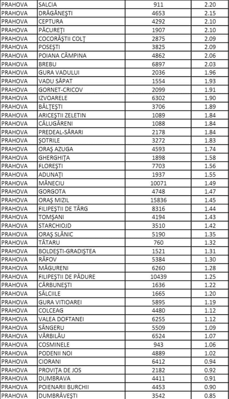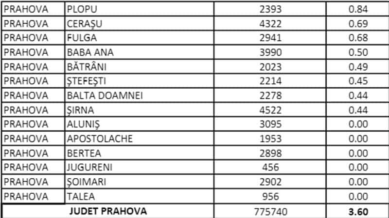 Păulești și Olari sunt cele mai afectate localități, cu incidențe de aproape 7 la mie, în acest moment, în timp ce la Ploiești, Măgurele, Sinaia, Urlați și Cornu rata infectărilor este între 5 și 6 la mie.
