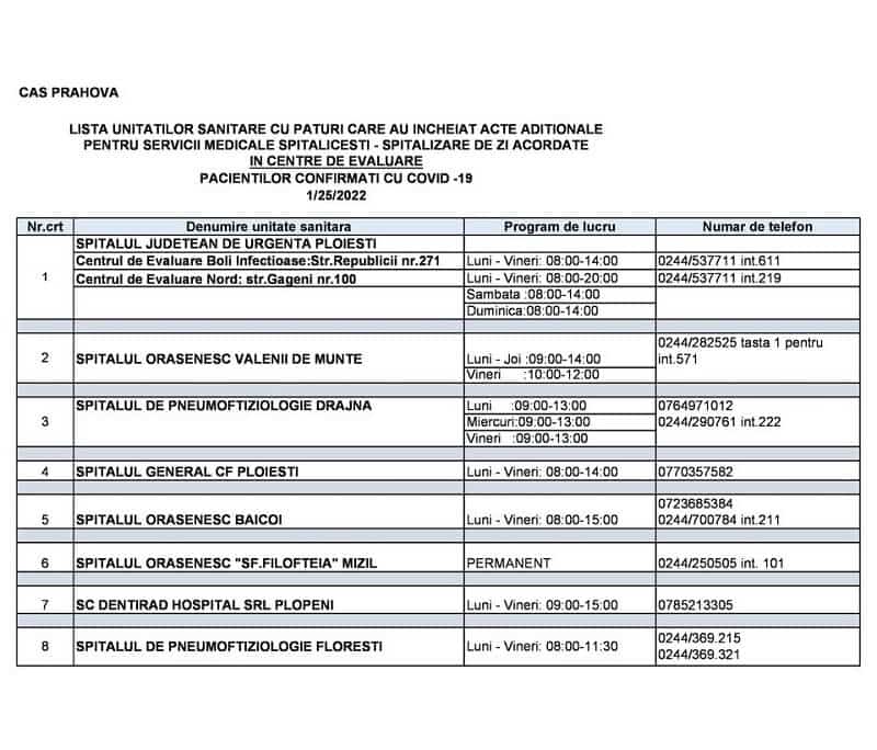 Cetățenii confirmați pozitiv cu Covid-19 se pot adresa unui al nouălea centru de evaluare deschis în Prahova, la Spitalul Orășenesc Urlați. Acesta va funcționa de luni până vineri, în intervalul 10.00-14.00.