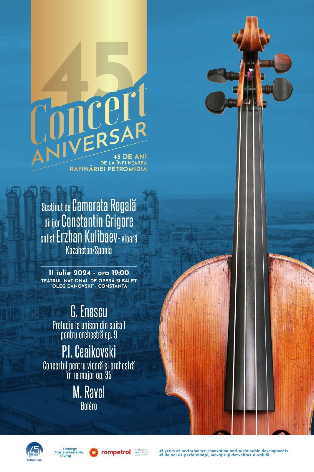Joi 11 iulie 2024 de la ora 19.00 Teatrul Național de Operă și Balet „Oleg Danovski” din Constanța va fi gazda unui concert susținut de Orchestra Camerata Regală, dirijor Constantin Grigore, solist Erzhan Kulibaev, vioară - câștigător al Concursului Internațional George Enescu, ediția a 15-a, 2016.