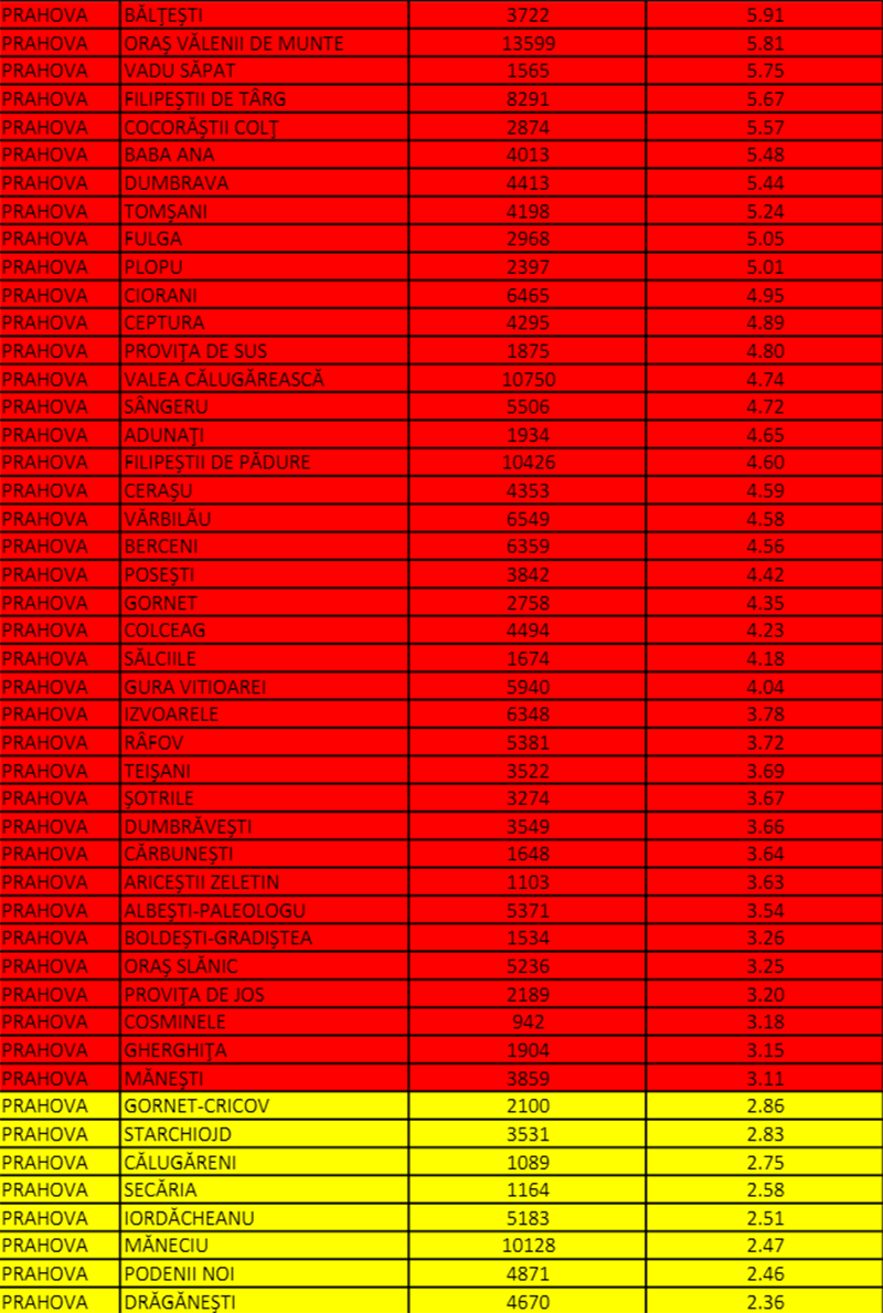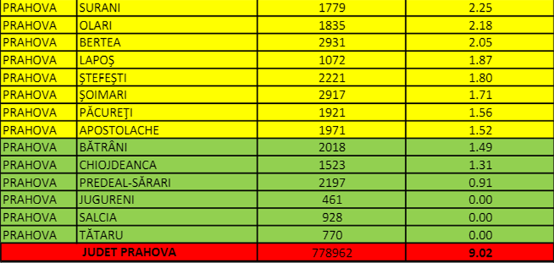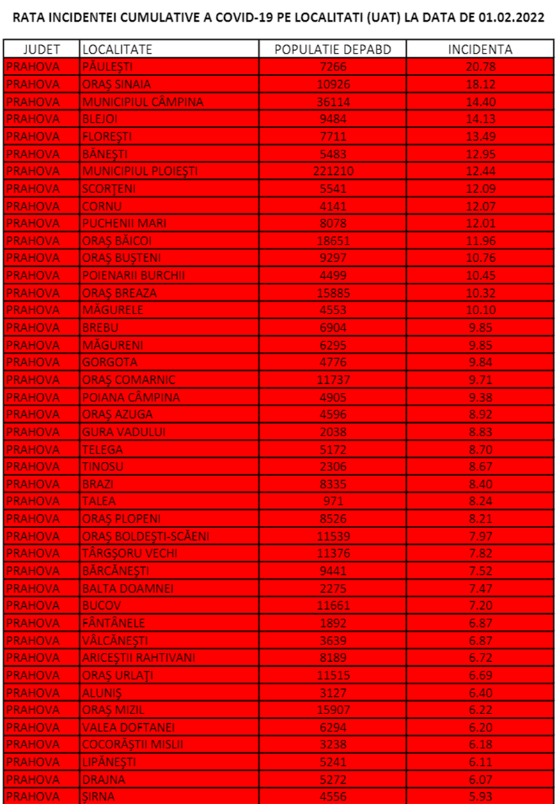 În total, Prahova are, la 1 februarie, 82 de localități în scenariul roșu, 16 în scenariul galben și numai șase în scenariul verde, dintre care trei (Jugureni, Salcia și Tătaru) cu incidența 0.