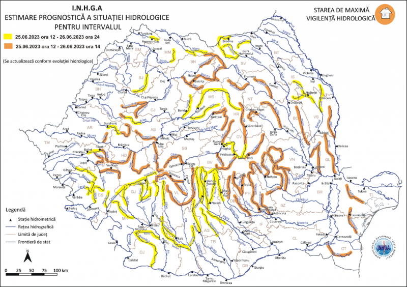 COD GALBEN  În intervalul 25.06.2023 ora 12:00 – 26.06.2023 ora 24:00 pe râurile din bazinele hidrografice: Vişeu – bazin superior şi afluenţi bazin mijlociu şi inferior, Iza – bazin superior şi afluenţi bazin mijlociu şi inferior, Lăpuș – bazin superior şi afluenţi bazin mijlociu şi inferior (judeţul Maramureș), Tur – bazin superior şi afluenţi bazin mijlociu şi inferior (judeţul Satu Mare), Someşul Mare – bazin superior și afluenţi bazin mijlociu și inferior (judeţul Bistriţa Năsăud), Someşul Mic – bazin superior și afluenţi bazin mijlociu și inferior (judeţele: Bihor şi Cluj), Someș – afluenții mici aferenți sectorului aval S.H. Dej (judeţele: Cluj, Sălaj, Maramureș şi Satu Mare), Crişul Alb – bazin amonte S.H. Gurahonţ şi afluenţii aferenţi sectorului aval S.H. Gurahonţ (judeţele: Hunedoara și Arad), Mureş – bazin amonte S.H. Glodeni şi afluenţii aferenţi sectorului aval S.H. Glodeni – amonte confluenţă cu râul Arieş (judeţele: Harghita, Mureş şi Bistriţa Năsăud), Arieş – bazin amonte S.H. Baia de Arieş şi afluenţii aferenţi sectorului aval S.H. Baia de Arieş (judeţele: Alba și Cluj), Mureș – afluenții aferenți sectorului aval confluenţă cu râul Arieş – amonte confluenţă cu râul Târnava (judeţele: Cluj şi Alba), Târnava Mică – bazin superior şi afluenţi bazin mijlociu şi inferior (judeţele: Harghita, Mureş şi Alba), Târnava Mare – bazin superior şi afluenţi bazin mijlociu şi inferior (judeţele: Harghita, Mureş, Braşov, Sibiu şi Alba), Mureș – afluenții aferenți sectorului aval confluenţă cu râul Târnava (judeţele: Alba, Sibiu, Hunedoara și Arad), Bega – bazin amonte S.H. Balinţ şi afluenţii aferenţi sectorului aval S.H. Balinţ – amonte S.H. Remetea (judeţul Timiş), Timiş – bazin amonte S.H. Teregova şi afluenţii aferenţi sectorului aval S.H. Teregova – amonte S.H. Lugoj (judeţele: Caraş Severin şi Timiş), Poganiş – bazin amonte Ac. Cadar Duboz (judeţul Caraş Severin), Bârzava – bazin superior şi afluenţi bazin mijlociu şi inferior (judeţele: Caraş Severin şi Timiş), Caraş – bazin superior şi afluenţi bazin mijlociu şi inferior, Nera – bazin superior şi afluenţi bazin mijlociu şi inferior (judeţul Caraş Severin), Cerna – bazin superior şi afluenţi bazin mijlociu şi inferior (judeţele: Gorj şi Caraş Severin), Desnăţui (judeţele: Mehedinţi şi Dolj), Jiu – bazin amonte S.H. Sadu şi afluenţii aferenţi sectorului aval S.H. Sadu – amonte confluenţă cu râul Gilort, Gilort – bazin superior şi afluenţi bazin mijlociu şi inferior, Motru – bazin superior şi afluenţi bazin mijlociu şi inferior, Jiu – afluenţii aferenţi sectorului aval confluenţă cu râul Motru – amonte S.H. Podari (judeţele: Hunedoara, Gorj, Mehedinţi şi Dolj), Olt – bazin amonte S.H. Hoghiz şi afluenţii aferenţi sectorului aval S.H. Hoghiz (judeţele: Harghita, Covasna, Braşov, Sibiu, Gorj, Argeş, Olt şi Dolj), Vedea – bazin superior şi afluenţi bazin mijlociu şi inferior (judeţele: Argeş, Olt şi Teleorman), Argeş – bazin superior şi afluenţi bazin mijlociu şi inferior (judeţele: Argeş, Dâmboviţa, Giurgiu, Teleorman şi Ilfov), Ialomiţa – bazin amonte Ac. Pucioasa şi afluenţii aferenţi sectorului aval Ac. Pucioasa – amonte S.H. Siliştea Snagovului (judeţele: Dâmboviţa, Prahova şi Ilfov), Prahova – bazin superior şi afluenţi bazin mijlociu şi inferior (judeţul Prahova), Suceava – bazin superior şi afluenţi bazin mijlociu şi inferior (judeţul Suceava), Moldova – bazin superior şi afluenţi bazin mijlociu şi inferior (judeţele: Suceava şi Neamţ), Bistriţa – bazin superior şi afluenţi bazin mijlociu şi inferior (judeţele: Suceava, Harghita, Neamţ şi Bacău), Trotuş – bazin superior şi afluenţi bazin mijlociu şi inferior (judeţele: Harghita, Bacău, Neamţ, Covasna şi Vrancea), Putna – bazin superior şi afluenţi bazin mijlociu şi inferior (judeţul Vrancea), Bârlad – bazin superior şi afluenţi bazin mijlociu şi inferior (judeţele: Neamţ, Vaslui, Iaşi, Bacău, Vrancea şi Galaţi), Râmnicu Sărat – bazin superior şi afluenţi bazin mijlociu şi inferior (judeţele: Vrancea şi Buzău), Buzău – bazin amonte Ac. Siriu şi afluenţii aferenţi sectorului aval Ac. Siriu – amonte S.H. Baniţa (judeţele: Braşov, Covasna, Buzău şi Prahova), Siret – afluenţii mici aferenţi sectorului aval confluenţă cu râul Trotuş (judeţele: Vrancea şi Galaţi), Prut – afluenţii aferenţi sectorului aval S.H. Drânceni (judeţele: Vaslui şi Galaţi), râurile din Dobrogea (judeţele: Constanţa şi Tulcea).