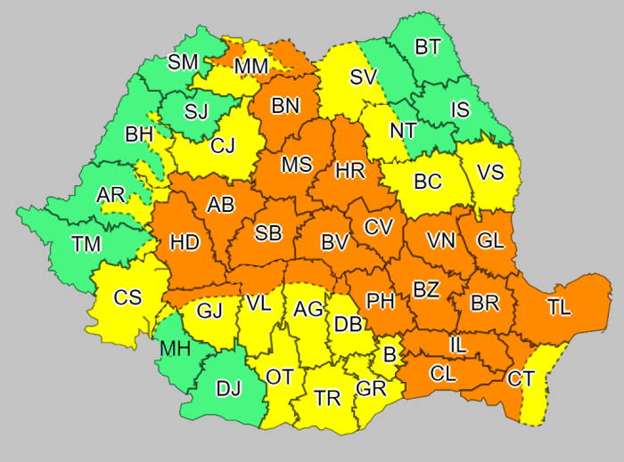 COD PORTOCALIU Interval de valabilitate: 25 iunie, ora 11.00 - 26 iunie, ora 4.00; Fenomene vizate:instabilitate atmosferică accentuată, averse torențiale; Pe parcursul zilei la munte, în centrul și sud-estul țării, iar seara și noaptea mai ales în sud-est, local vor fi averse torențiale, descărcări electrice, intensificări de scurtă durată ale vântului (rafale de 65...75 km/h) și pe arii restrânse vijelii și grindină. În intervale scurte de timp (1-3 ore) sau prin acumulare cantitățile de apă vor fi de 30...40 l/mp și izolat de peste 50...60 l/mp.