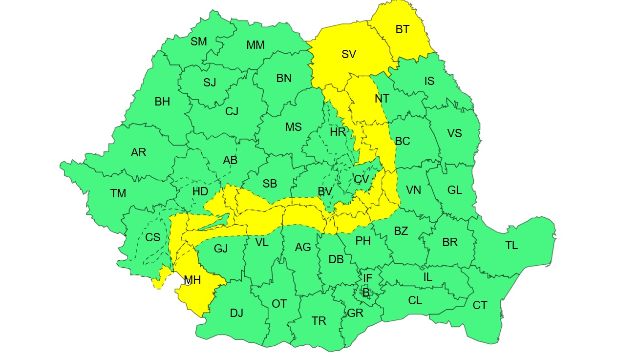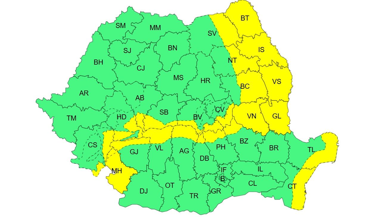 Codul Galben este valabil din 27 decembrie, ora 16, până pe 28 decembrie, ora 02. Vântul va sufla cu putere în nordul Moldovei și vestul Olteniei, iar în Carpații Meridionali și Orientali rafalele pot depăși 90–110 km/h în zona înaltă.