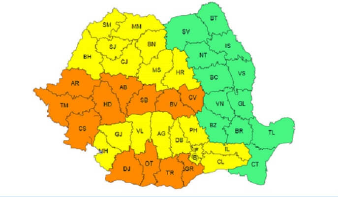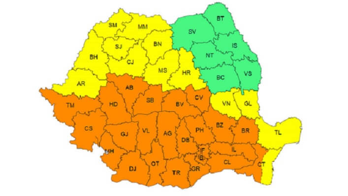 Cod portocaliu de căldură vineri, astfel încât în Banat, în sudul Olteniei, în sud-vestul Munteniei, precum și în sudul Transilvaniei și al Crișanei se vor înregistra temperaturi deosebit de ridicate pentru această dată. Maximele se vor situa, în general, între 33 și 37 de grade, va fi caniculă și disconfort termic accentuat, iar indicele temperatură-umezeală (ITU) va depăși pragul critic de 80 de unități.