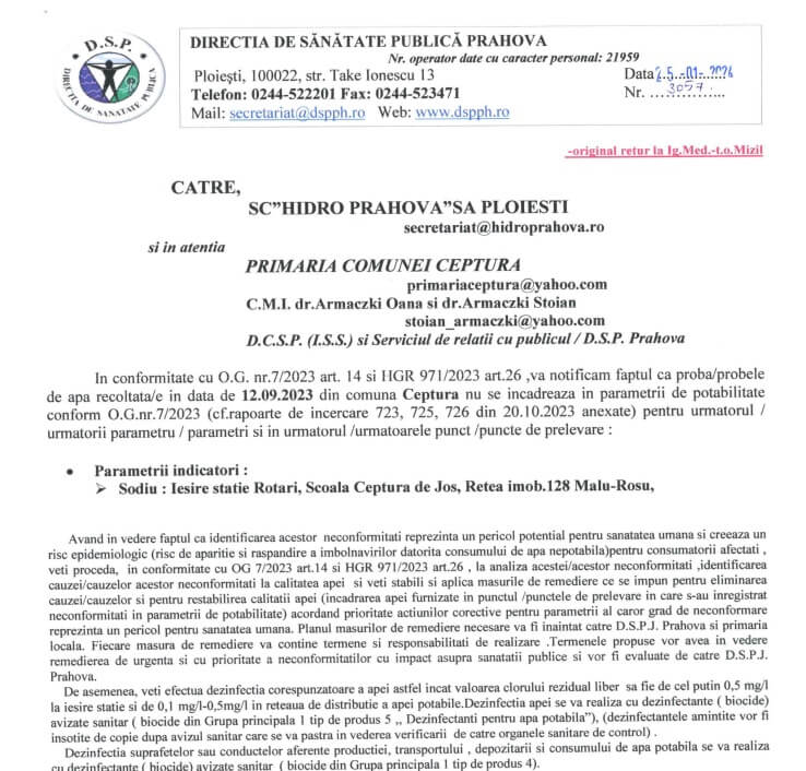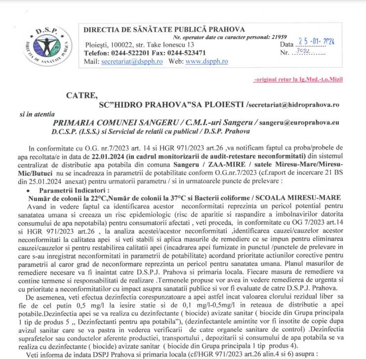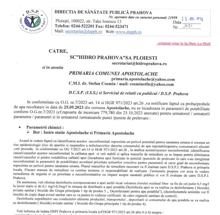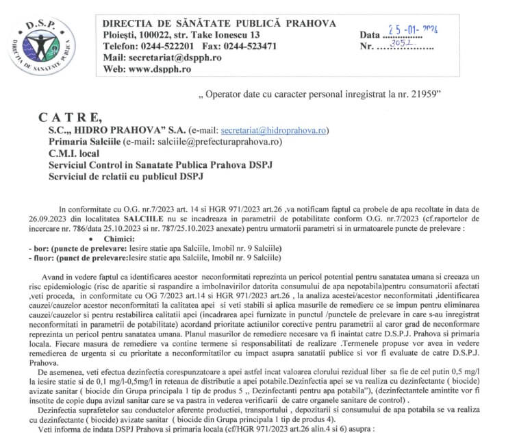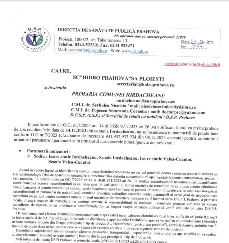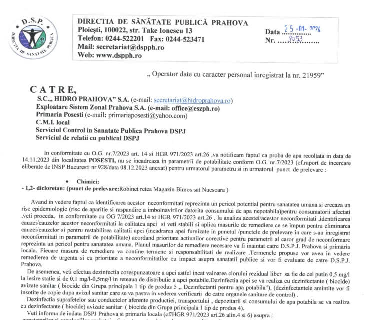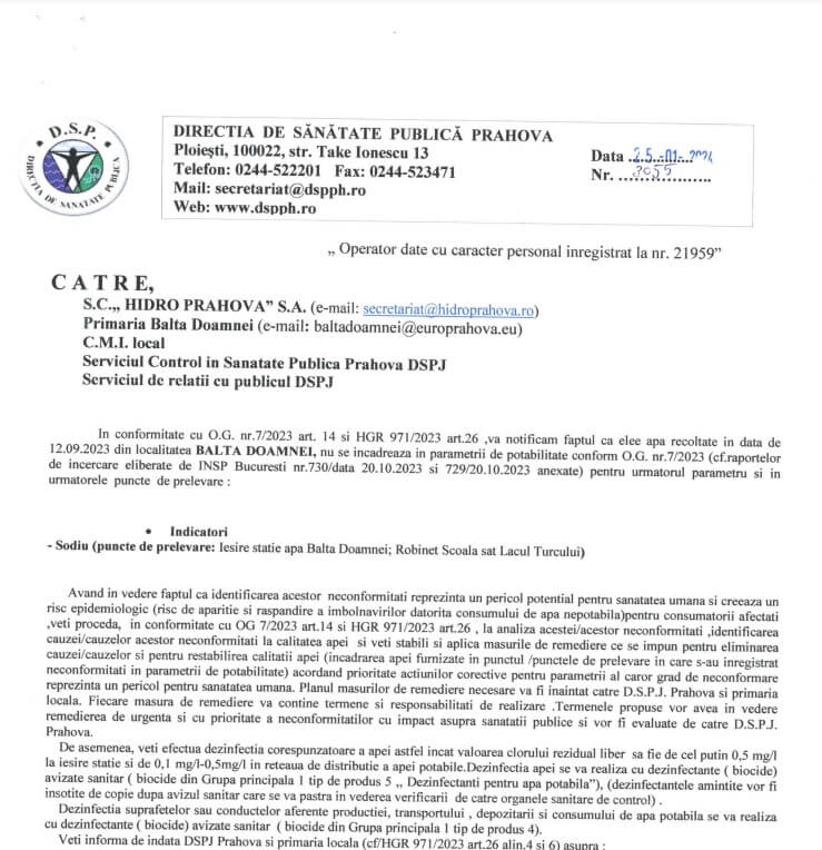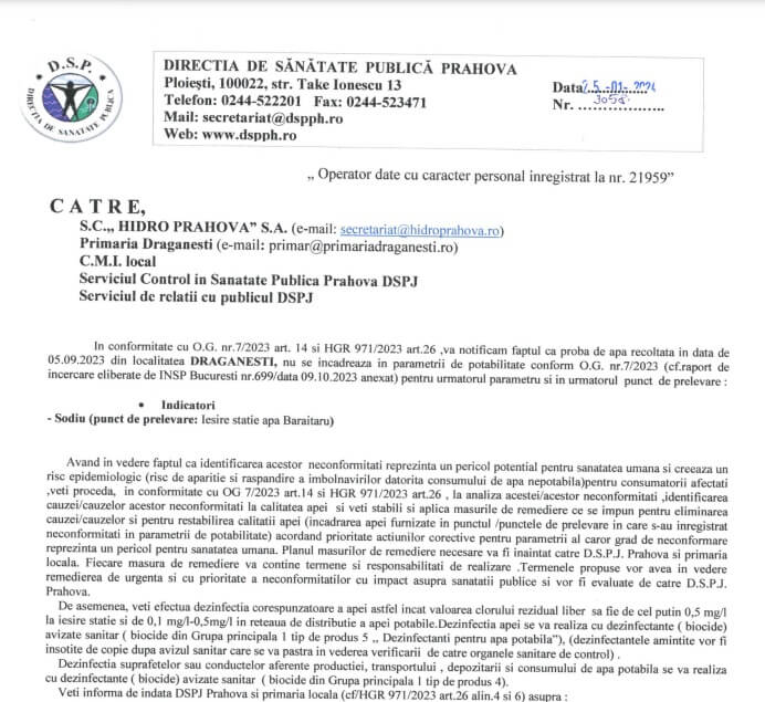 DSP Prahova a înștiințat Prefectura că „în cadrul monitorizării de audit a calității apei potabile efectuată în anul 2023 (N.R. Ar fi vorba de probe recoltate în septembrie 2023!) au fost înregistrate unele neconformități la calitatea apei potabile distribuite la nivelul unor zone de aprovizionare cu apă exploatate de către Hidro Prahova. Este vorba despre localitățile Drăgănești, Balta Doamnei, Ceptura, Iordăcheanu, Fulga, Posești, Salciile, Apostolache și Boldești Grădiștea.