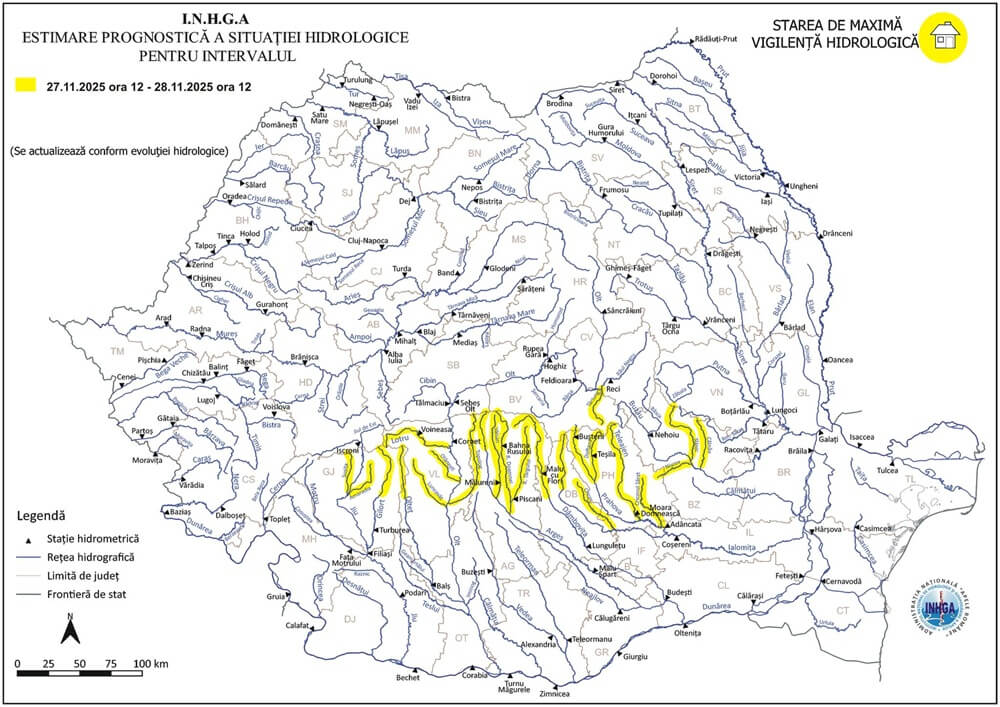 „Având în vedere situaţia hidrometeorologică actuală şi prognoza meteorologică pentru următoarele 24 de ore, INHGA a instituit Codul Galben de inundații, valabil în intervalul 27 noiembrie, ora 12:00 – 28 noiembrie, ora 12:00.