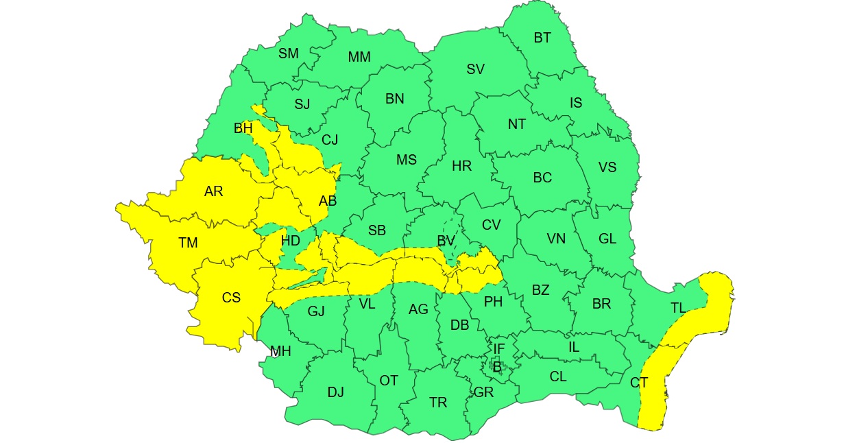 Judeţele marcate cu Cod galben sunt: Arad, Timiş şi Caraş-Severin integral şi Alba, Argeş, Bihor, Braşov, Cluj, Constanţa, Dâmboviţa, Gorj, Hunedoara, Prahova, Sibiu, Tulcea şi Vâlcea, parţial. Atenţionarea este valabilă până miercuri dimineaţa, la ora 8:00