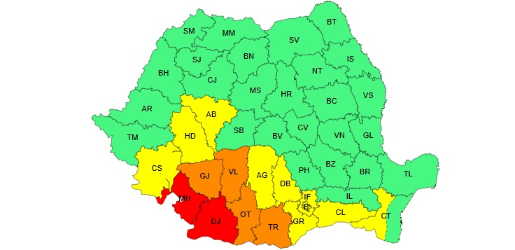 Administrația Națională de Meteorologie a emis o avertizare cod roșu de caniculă valabilă luni în județele Mehedinți și Dolj. Se vor înregistra temperaturi de 39 - 41 de grade.