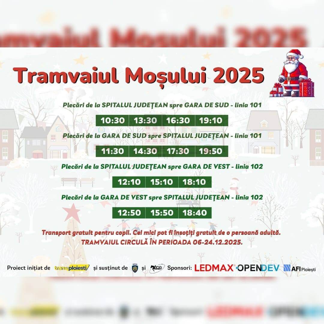 În municipiul Ploiești, Tramvaiul Moșului circulă pe tot parcursul lunii decembrie, aducând bucurie copiilor și familiilor. Peste 10.000 de cadouri au fost pregătite pentru cei mici, iar fiecare cursă este plină de zâmbete și entuziasm.