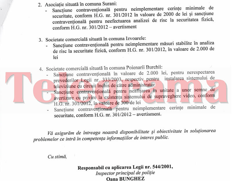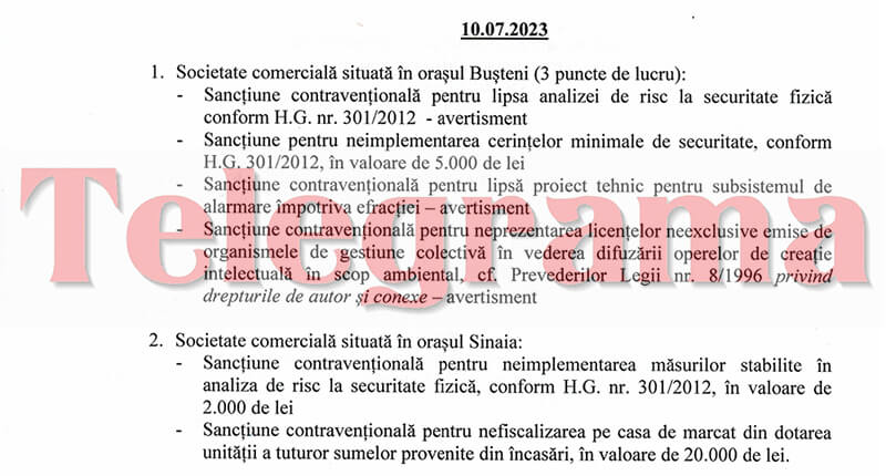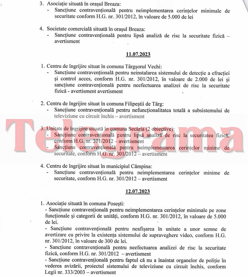 În răspunsul transmis la solicitarea înaintată de Telegrama, reprezentanții IJP Prahova a precizat că au fost sancționate centre din Bușteni, Sinaia, Breaza, Târgșorul Vechi, Filipeștii de Târg, Secăria, Câmpina, Posești, Surani, Izvoarele și Poienarii Burchii, astfel: