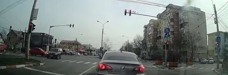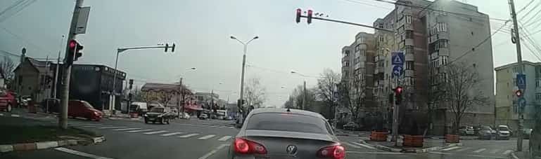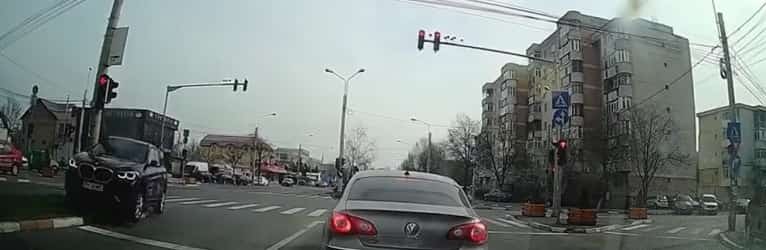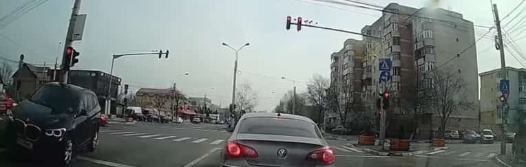 În imagini se vede cum mașina șoferului care venea dinspre centru, pe str. Mărășești, intră pe roșu în intersecție. Un alt autoturism, care venea dinspre Cosminele și pornise pe verde, este oprit brusc. Impactul este evitat la limită, deoarece BMW-ul virează brusc și intră pe contrasens.