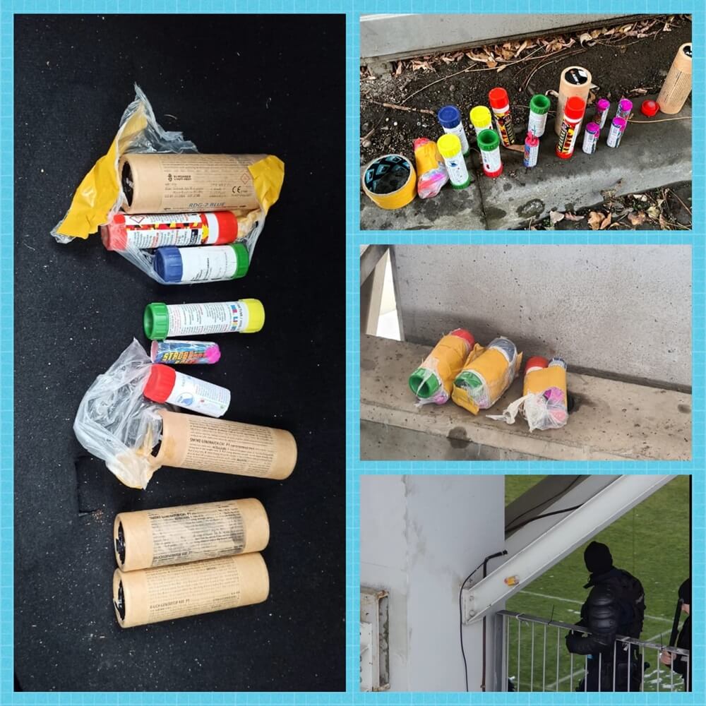 „Aceste demersuri au avut drept scop identificarea unor eventuale materiale interzise. În urma controalelor efectuate, au fost depistate peste 20 de materiale pirotehnice, din diverse categorii, ascunse în diferite zone ale stadionului, cu scopul de a fi folosite în timpul partidei. Cele mai multe au fost descoperite într-un rucsac agățat de unul dintre gardurile exterioare ale stadionului, altele erau lipite de unul dintre pilonii de susținere a copertinei, iar câteva dintre articole erau dosite sub scaunele Peluzei 2.