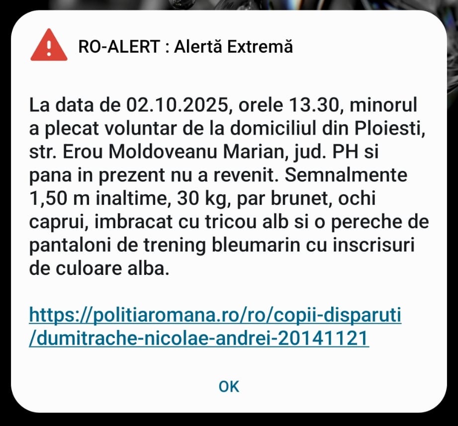 La data de 2 octombrie, o femeie a anunțat la Secția de Poliție nr. 3 Ploiești faptul că minorul, DUMITRACHE NICOLAE ANDREI de 10 ani, a plecat în mod voluntar din municipiul Ploiești și nu a mai revenit până în prezent.