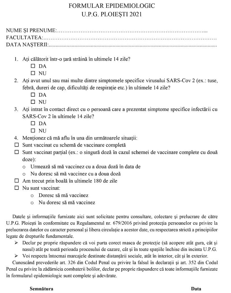 "Ca urmare a situației epidemiologice, pentru prevenirea îmbolnăvirilor cu virusul SARS-CoV-2, la începutul anului universitar 2021-2022 toți studenții vor completa următorul formular, ce trebuie prezentat la decanatul facultății", se arată în anunțul transmis de Consiliul de Administrație al UPG Ploiești.