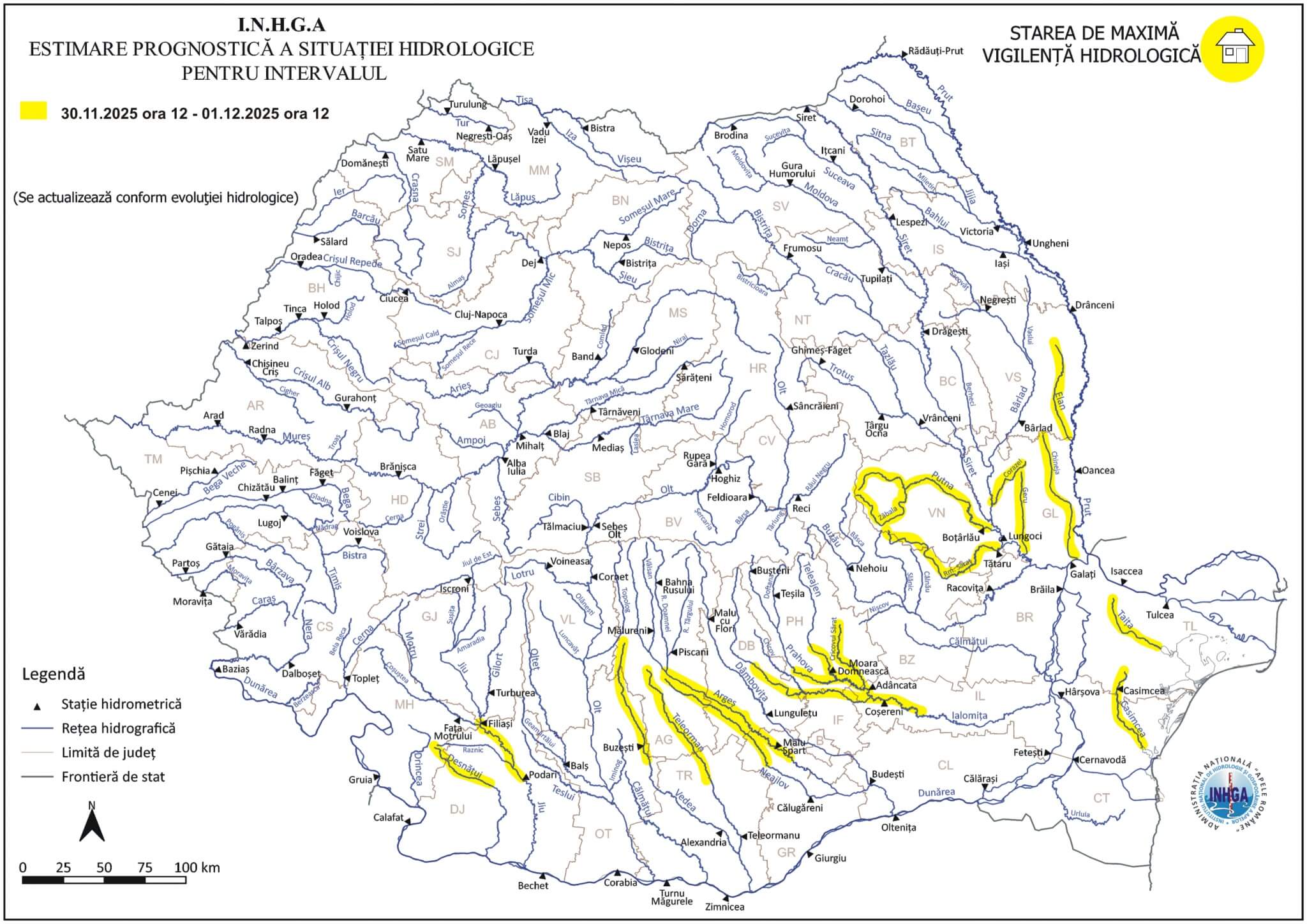 În intervalul 30.11.2025 ora 12:00 – 01.12.2025 ora 12:00 pe râurile din bazinele hidrografice: Desnăţui – bazin superior (judeţele: Mehedinţi şi Dolj), râul Jiu pe sectorul aval S.H. Filiaşi – amonte S.H. Podari (judeţele: Gorj şi Dolj), Vedea – bazin amonte S.H. Văleni, Teleorman (afluent al râului Vedea) – judeţele: Argeş, Olt şi Teleorman, râul Argeş pe sectorul aval confluenţă cu râul Râul Doamnei – amonte Ac. Mihăileşti (judeţele: Argeş şi Giurgiu), Neajlov (afluent al râului Argeş) – judeţele: Argeş, Dâmboviţa şi Giurgiu, Sabar (afluent al râului Argeş) – judeţele: Argeş, Dâmboviţa, Ilfov şi Giurgiu, râul Ialomiţa pe sectorul aval S.H. Băleni – amonte S.H. Ciochina (judeţele: Dâmboviţa, Prahova, Ilfov şi Ialomiţa), Prahova – bazin aval S.H. Prahova (judeţele: Prahova şi Ialomiţa), Râmnicu Sărat (judeţele: Vrancea şi Buzău), Putna (judeţul Vrancea), Bârlad – afluenţii mici aferenţi sectorului aval S.H. Bârlad (judeţele: Vaslui, şi Galaţi), Siret – afluenţii mici aferenţi sectorului aval confluenţă cu râul Trotuş (judeţele: Vrancea şi Galaţi), Prut – afluenţii aferenţi sectorului aval S.H. Fălciu (judeţele: Vaslui şi Galati), râurile din judeţul Tulcea şi din jumătatea de nord a judeţului Constanţa.