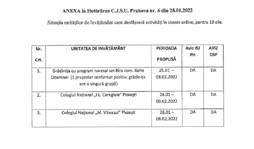 Documentul reprezintă mai degrabă îndeplinirea unei formalități având în vedere că este vorba despre o grădiniță și două colegii din Ploiești care, la ora adoptării hotărârii, suspendaseră deja cursurile în format fizic.
