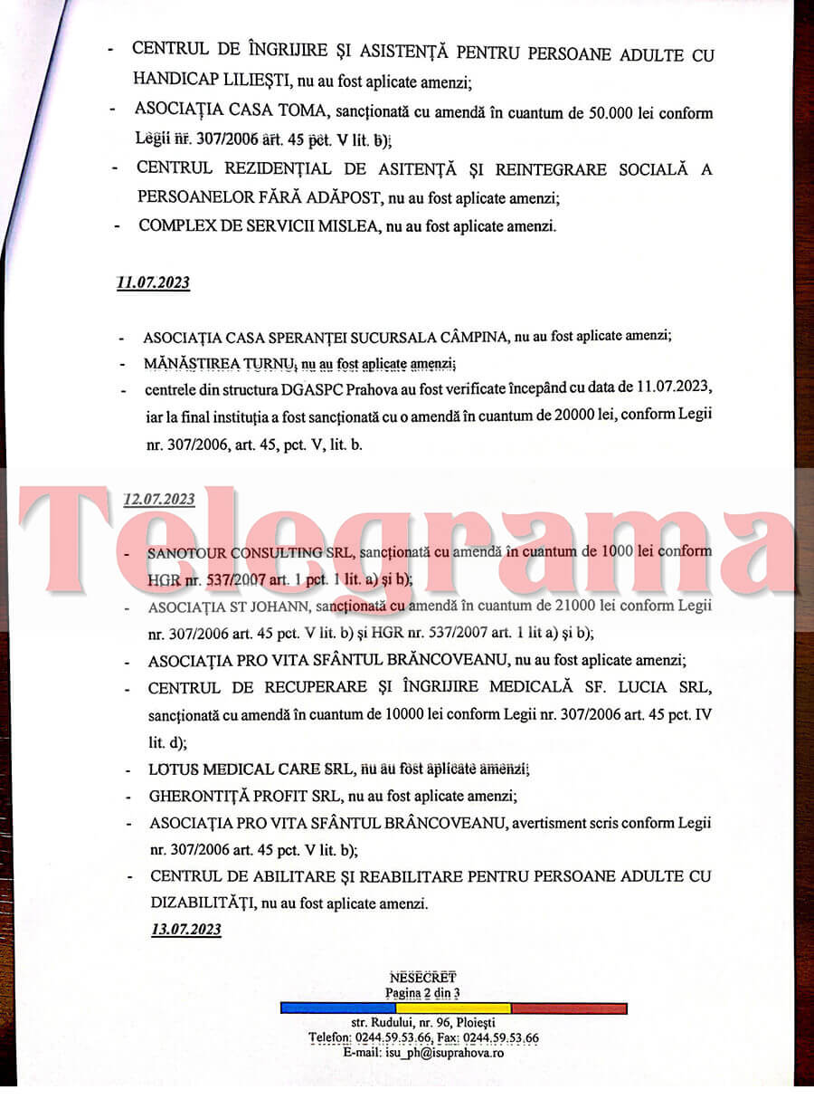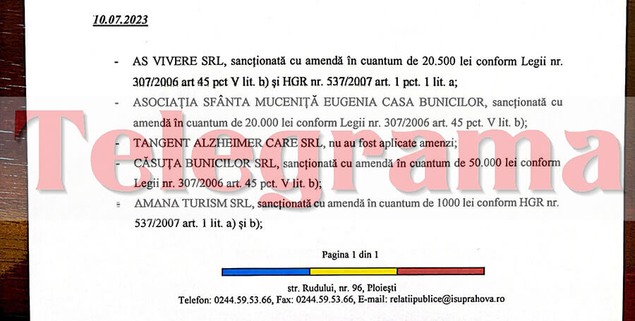 Cele mai mari amenzi au fost date pentru Casa Bunicilor SRL (50.000 de lei), Asociația Casa Toma (50.000 de lei) și Alegria Lux Residence SRL Ploiești (50.000 de lei). Și Direcția pentru Asistență Socială și Protecția Copilului a fost sancționată, cu 20.000 de lei, pentru neregulile depistate de inspectorii ISU pe parcursul verificărilor în centrele din structura instituției.