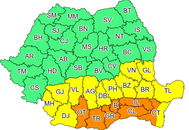 Canicula persistă, de asemenea, în sudul țării, unde astăzi și mâine temperaturile maxime se vor situa în general între 33 și 37 de grade, iar cele minime între 18 și 23 de grade. Excepția fac  județele Olt, Teleorman, Giurgiu, Ilfov, Călărași, Ialomița, Constanța și municipiul București care se vor afla, sâmbătă, sub cod portocaliu, pentru că se vor înregistra temperaturi maxime de 38...39 de grade, disconfortul termic va fi accentuat, iar indicele temperatură-umezeală (ITU) va depăși pragul critic de 80 de unități.