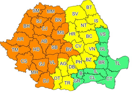 Începând cu ora 18.00, în multe județe va fi valabil cod portocaliu de instabilitate atmosferică. Potrivi ANM, diseară și la noapte, în Banat, Crișana, Maramureș, cea mai mare parte a Transilvaniei și Olteniei, precum și în nord-vestul Munteniei vor fi perioade cu instabilitate atmosferică accentuată. Aceasta se va manifesta prin intensificări ale vântului (rafale de 70...90 km/h și izolat de peste 100 km/h), vijelii puternice, grindină de medii și posibil mari dimensiuni, frecvente descărcări electrice și averse torențiale (în intervale scurte de timp, de 1 până la 3 ore, cantitățile de apă vor fi de 30...40 l/mp și izolat peste 50 l/mp).