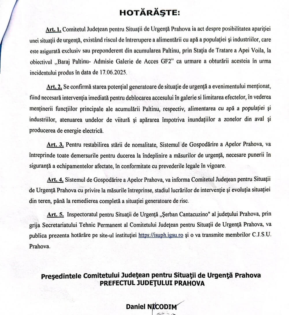 „CJSU ia act despre posibilitatea apariției unei situații de urgență, existând riscul de întrerupere a alimentări cu apă a populației și industriilor, care este asigurată exclusiv sau preponderent din acumularea Paltinu, prin Stația de Tratare a Apei Voila, la obiectivul Baraj Paltinu - Admisie Galerie de Acces GF2, ca urmare a obturării acesteia în urma incidentului produs în data de 17.06.2025.