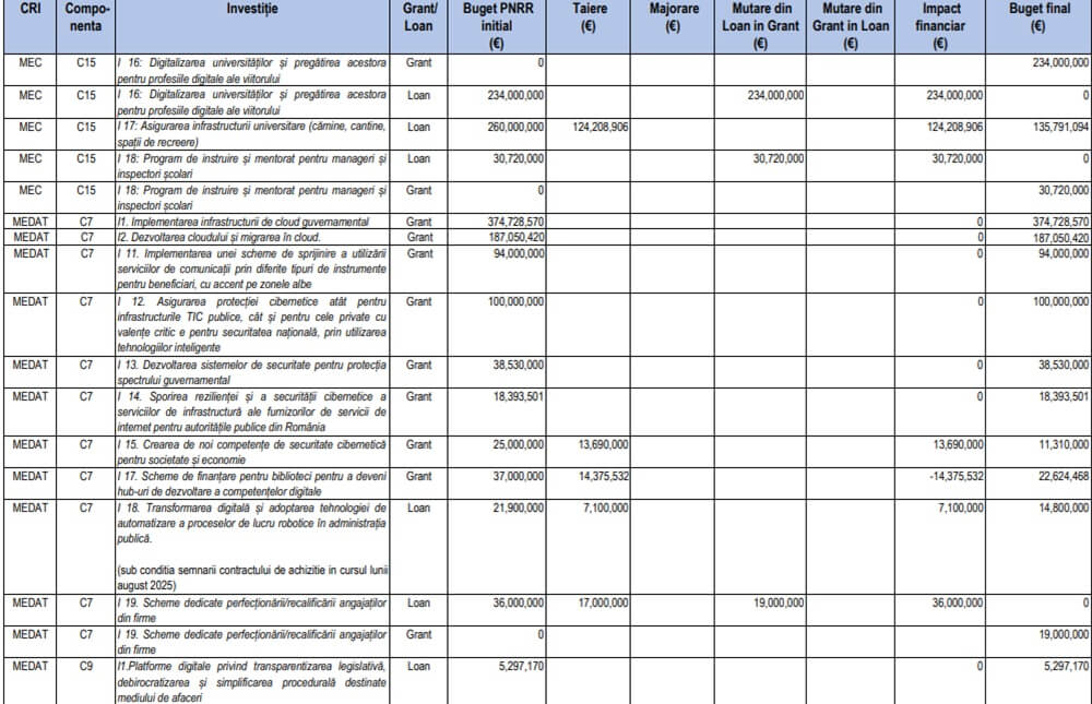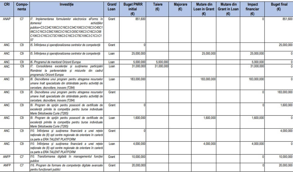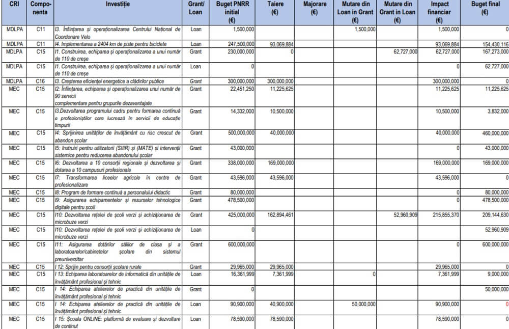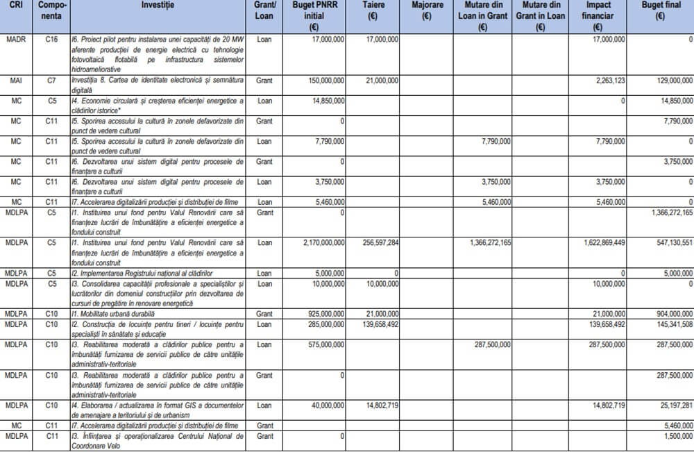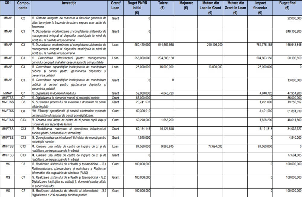 Lista completă a proiectelor din PNRR modificate