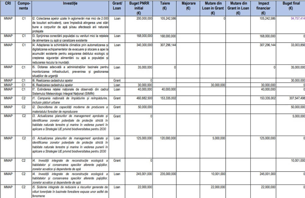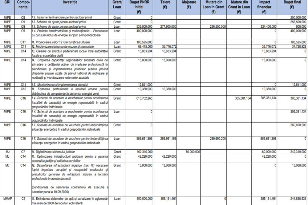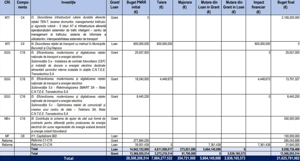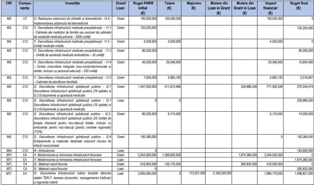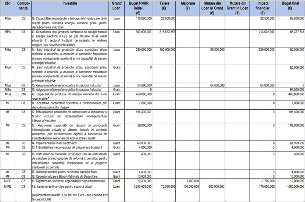 Economedia menționează că valoarea alocată României prin PNRR s-a redus de la 28,5 miliarde de euro (14,9 miliarde euro sub formă de împrumuturi, 13,6 miliarde euro sub formă de granturi) la 21,62 miliarde de euro (1 (13,56 miliarde de euro sub formă de granturi și 8,06 miliarde de euro sub formă de împrumuturi). MIPE a decis să ajusteze componenta de împrumut din PNRR, cu aproximativ 6,88 miliarde de euro, luând în considerare necesitatea încadrării în traiectoria fiscală asumată de România și ținând cont de capacitatea maximă a spațiului fiscal necesar pentru gestionarea acesteia. Se cuvine să menționăm și faptul că, în cadrul aceleiași componente de împrumut, au fost aprobate investiții noi în valoare de 284 milioane de euro (capitalizare Banca de Investiții și Dezvoltare și achiziția a 1.200 de ambulanțe), precum și ajustări de prețuri în cadrul investițiilor inițiale menținute în program.