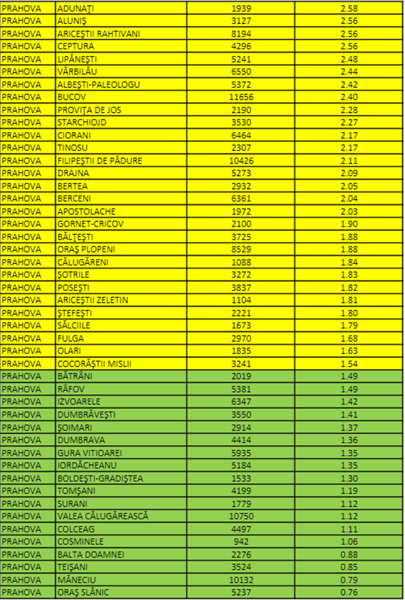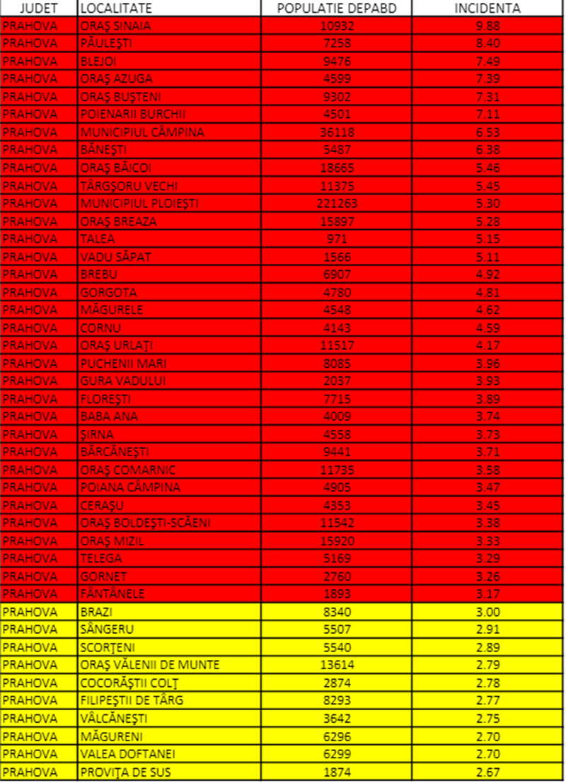 33 de localități din Prahova, inclusiv municipiile Ploiești și Câmpina, dar și orașele Sinaia, Azuga, Bușteni, Băicoi, Breaza, Comarnic, Urlați, Boldești și Mizil sunt în scenariul roșu, având rata infectărilor între 3 și 10 cazuri active la mia de locuitori.