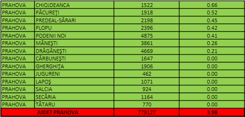 Doar 32 de localități prahovene se mai află în scenariul verde, printre acestea aflându-se un singur oraș: Slănic. Potrivit datelor publicate de DSP Prahova, în Cărbunești, Gherghița, Jugureni, Lapoș, Salcia, Secăria și Tătaru nu există niciun caz activ de Covid, la acest moment.