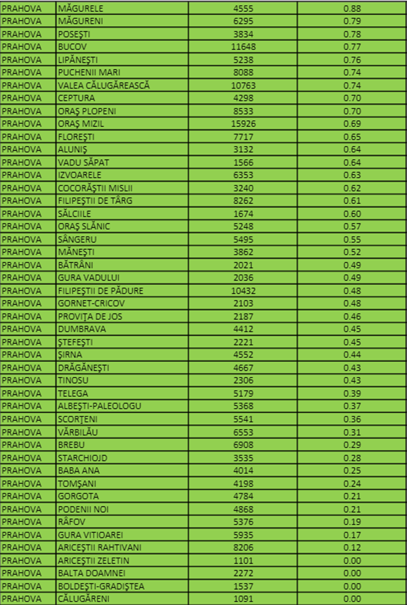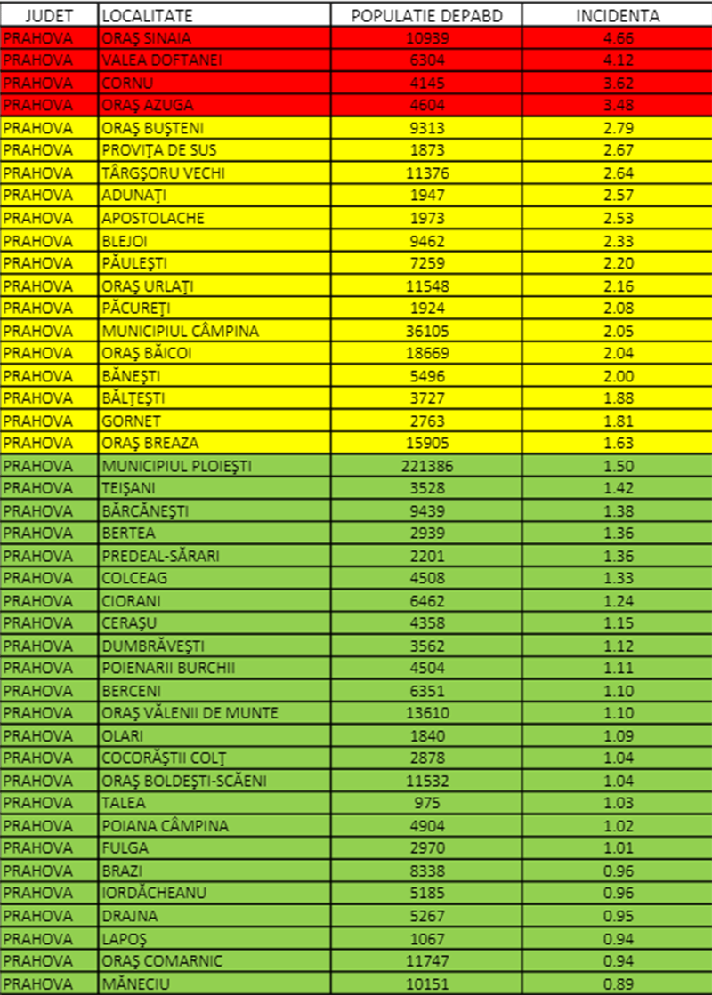 În alte 15 localități, printre care și municipiul Câmpina, rata infectărilor este între 1,5 și 3 la mie, acestea aflându-se în scenariul galben. De pragul amintit va trece, foarte probabil în următoarele ore, și municipiul Ploiești.