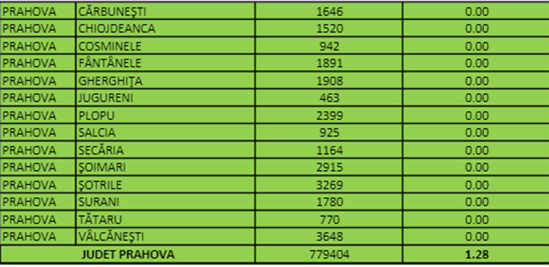 Prahova are, potrivit datelor transmise, miercuri, de Direcția de Sănătate Publică, 1,28 cazuri active la 1.000 de locuitori.