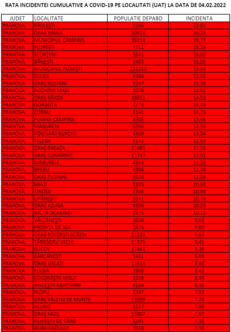 Rata infectărilor în localitățile din Prahova, la 4 februarie