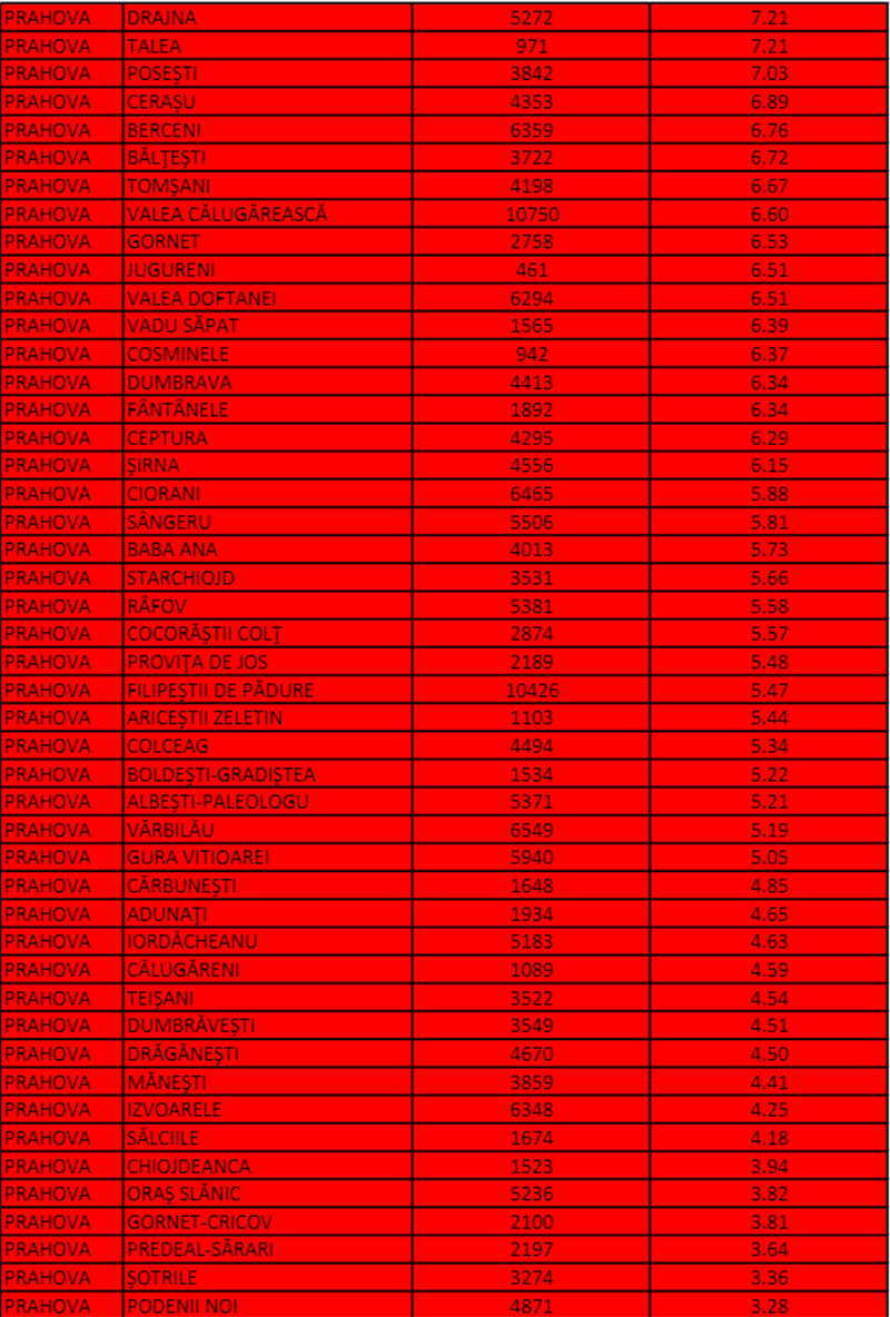 Doar Tătaru și Salcia mai sunt în scenariul verde, iar alte nouă comune sunt în scenariul galben. Astfel, 93 de comune și orașe prahovene au, în prezent, incidența peste 3 la mie, iar două dintre ele au trecut chiar de 20 de cazuri active la 1.000 de locuitori. În această situație se află Păulești și Sinaia, dar foarte aproape de depășirea pragului a ajuns și Câmpina.