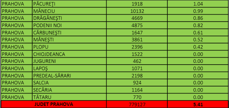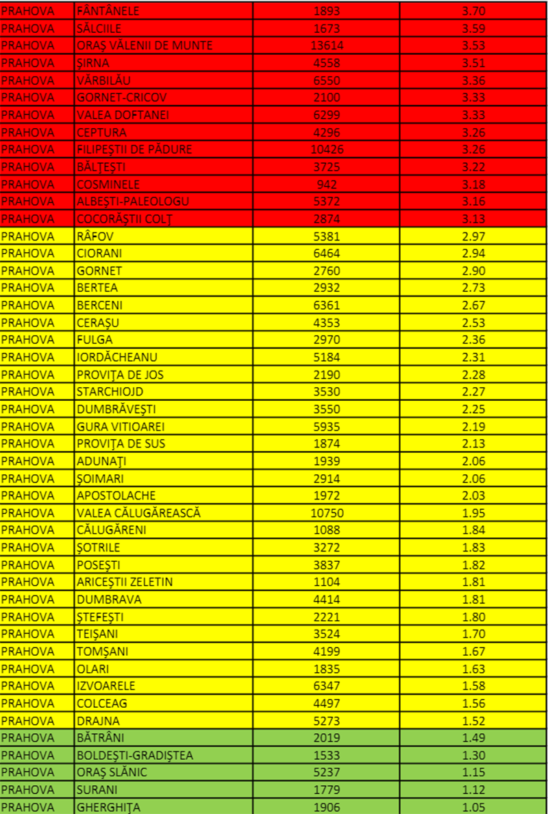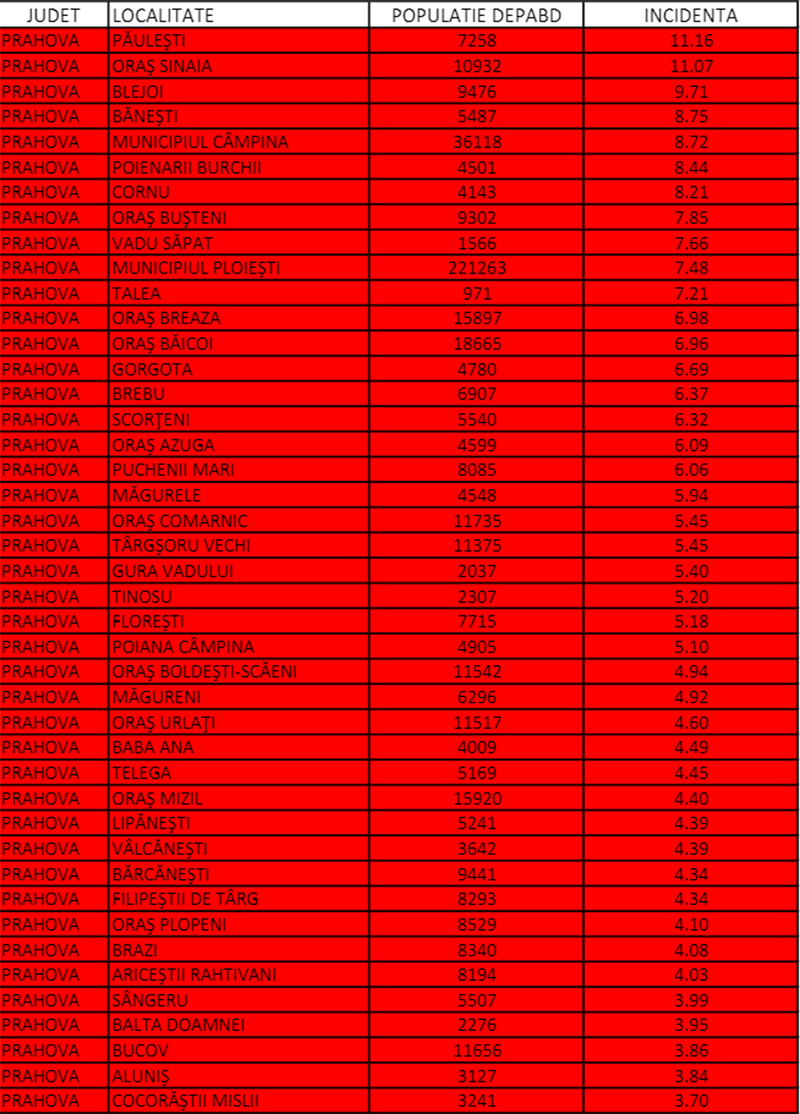 La acest moment, peste jumătate dintre orașele și comunele prahovene au incidența peste 3 la mie, recordurile zilei fiind stabilite de Păulești și Sinaia, cu 11,16, respectiv 11,07 la mie.