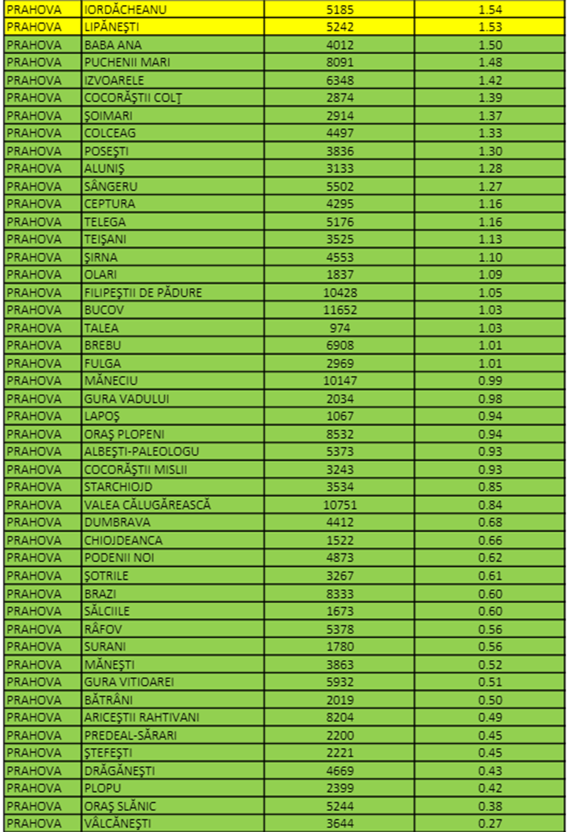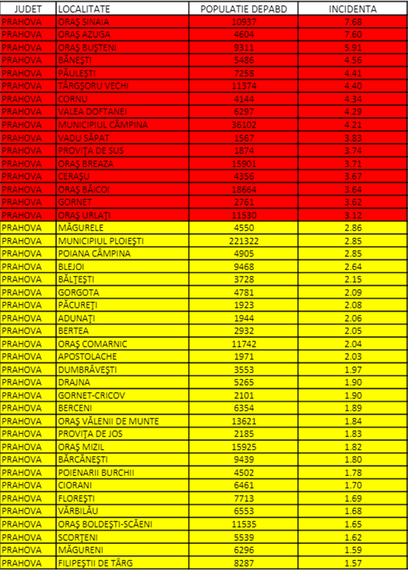 Din cele 104 localități ale județului, aproape 30 sunt în scenariul galben, iar 16 sunt în scenariul roșu. Din datele furnizate de DSP, cel mai mare risc de infectare este, în continuare, pe Valea Prahovei. La Sinaia și Azuga, incidența se îndreaptă spre 8 la mie, iar la Bușteni este de aproape 6 la mie.