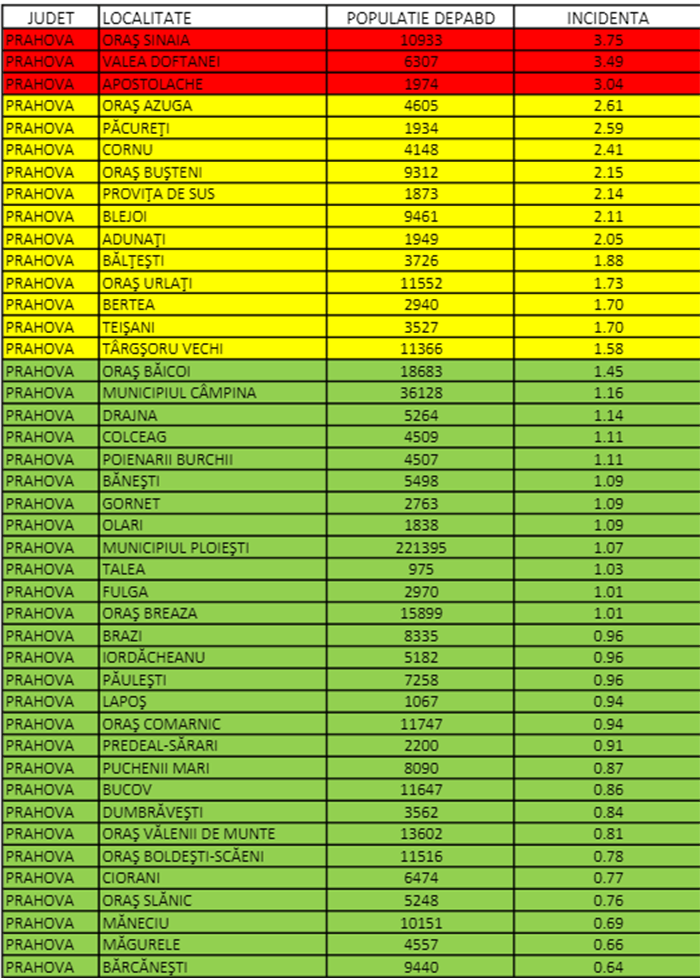 Cea mai mare incidență este la Sinaia, care se apropie de 4 la mie, urmată de Valea Doftanei și Apostolache. Cele trei localități sunt în scenariul roșu, iar alte 12 (inclusiv Azuga, Bușteni și Urlați) în scenariul galben.