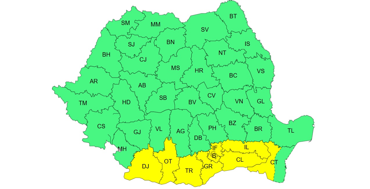 Sunt vizate de avertizarea cod galben Bucureşti, Călăraşi, Constanţa, Dolj, Giurgiu, Ilfov, Ialomiţa, Olt, Teleorman.