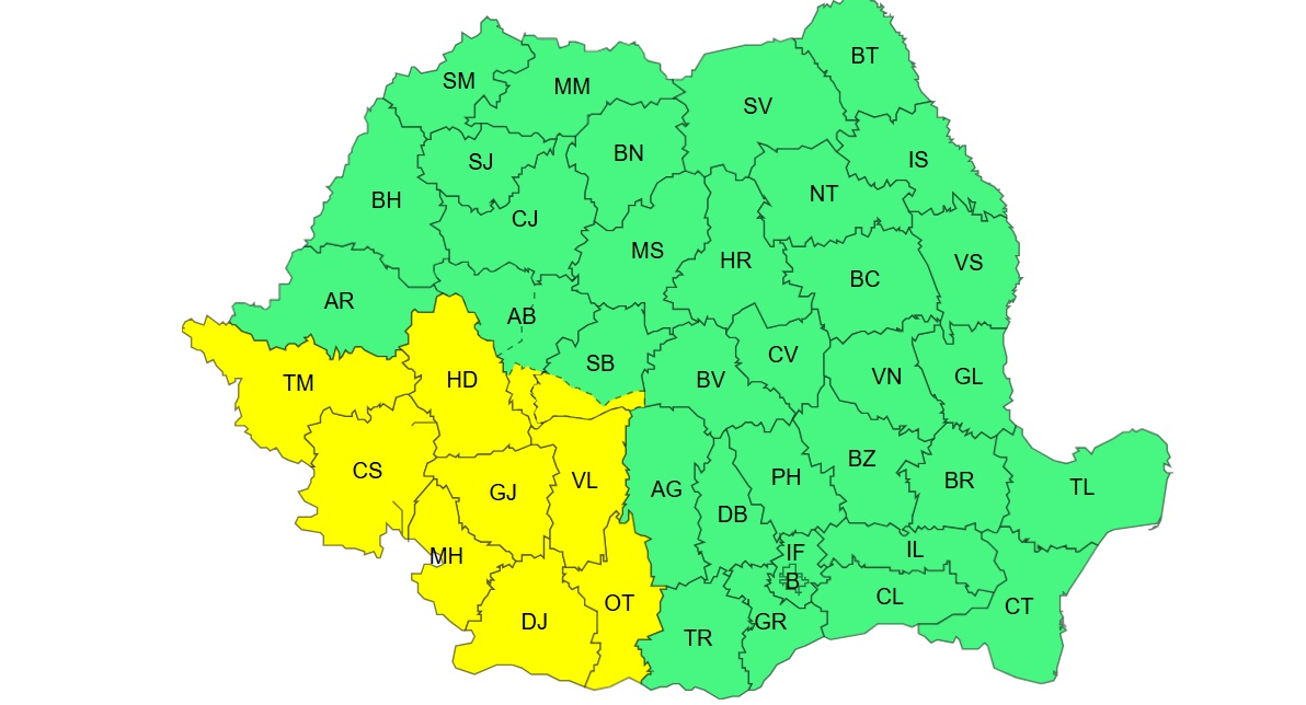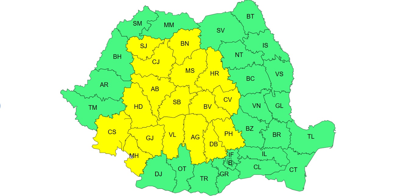 Potrivit acestora, codul galben vizează judeţele Alba, Argeş, Bistriţa-Năsăud, Braşov, Cluj, Caraş-Severin, Covasna, Dâmboviţa, Gorj, Hunedoara, Harghita, Mehedinţi, Mureş, Prahova, Sibiu, Sălaj şi Vâlcea.