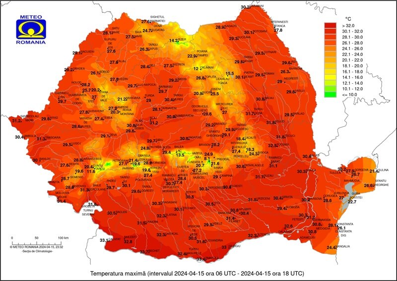 Datele publicate de ANM arată că maximele zilei au trecut de 30 de grade în toate zonele joase din Muntenia și Oltenia, precum și în sudul Moldovei, în vestul și în centrul țării. Nici în restul regiunilor nu a fost răcoare. Cele mai mici valori maxime au fost înregistrate pe litoral și, evident, la munte, dar și acolo termometrul a indicat și peste 20 de grade Celsius.