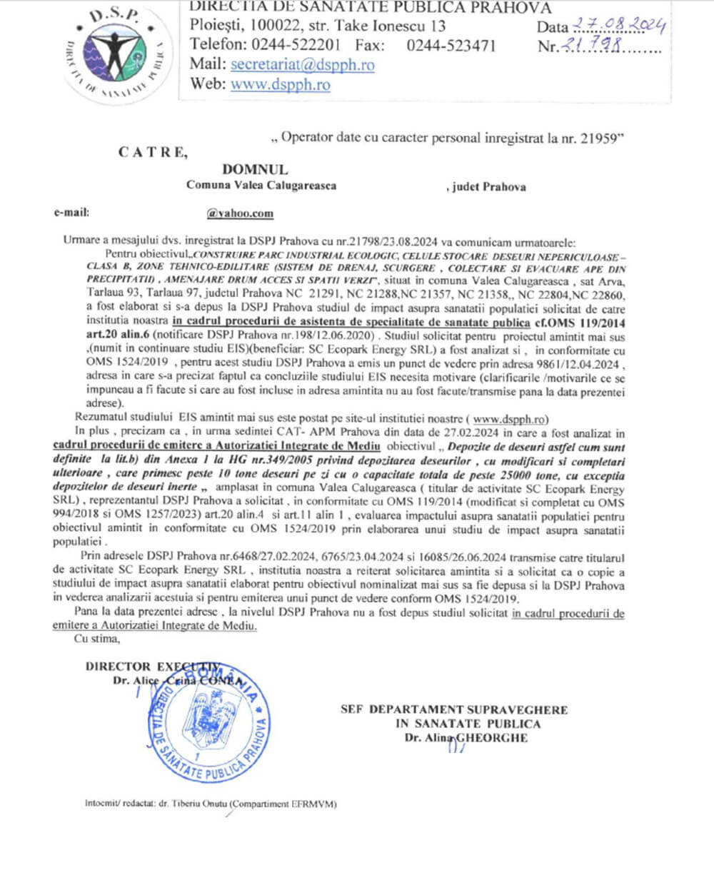 În contextul descris, un locuitor din Valea Călugărească a solicitat, la DSP Prahova, detalii despre noul proiect. Autoritățile sanitare au transmis printr-un răspuns emis la finalul lunii august, că pentru acest obiectiv „a fost elaborat și s-a depus la DSPJ Prahova studiul de impact asupra sămătății populației colicitat de instituția noastră în cadrul procedurii de asistență de specialitate de sănătătate publică (...) Studiul solicitat pentru proiectul amintit mai sus (...) a fost analizat și, în conformitate cu OMS 1542/2019, pentru acest studiu DSPJ Prahova a emis un punct de vedere prin adresa 9861/12.04/2024, adresă în care s-a precizat faptul că concluziile studiului EIS necesită motivare (calrificările/motivările ce se impuneau a fi făcute și cate au fost incluse în adresa amintită nu au fost făcute/transmise până la data prezentei adrese”.