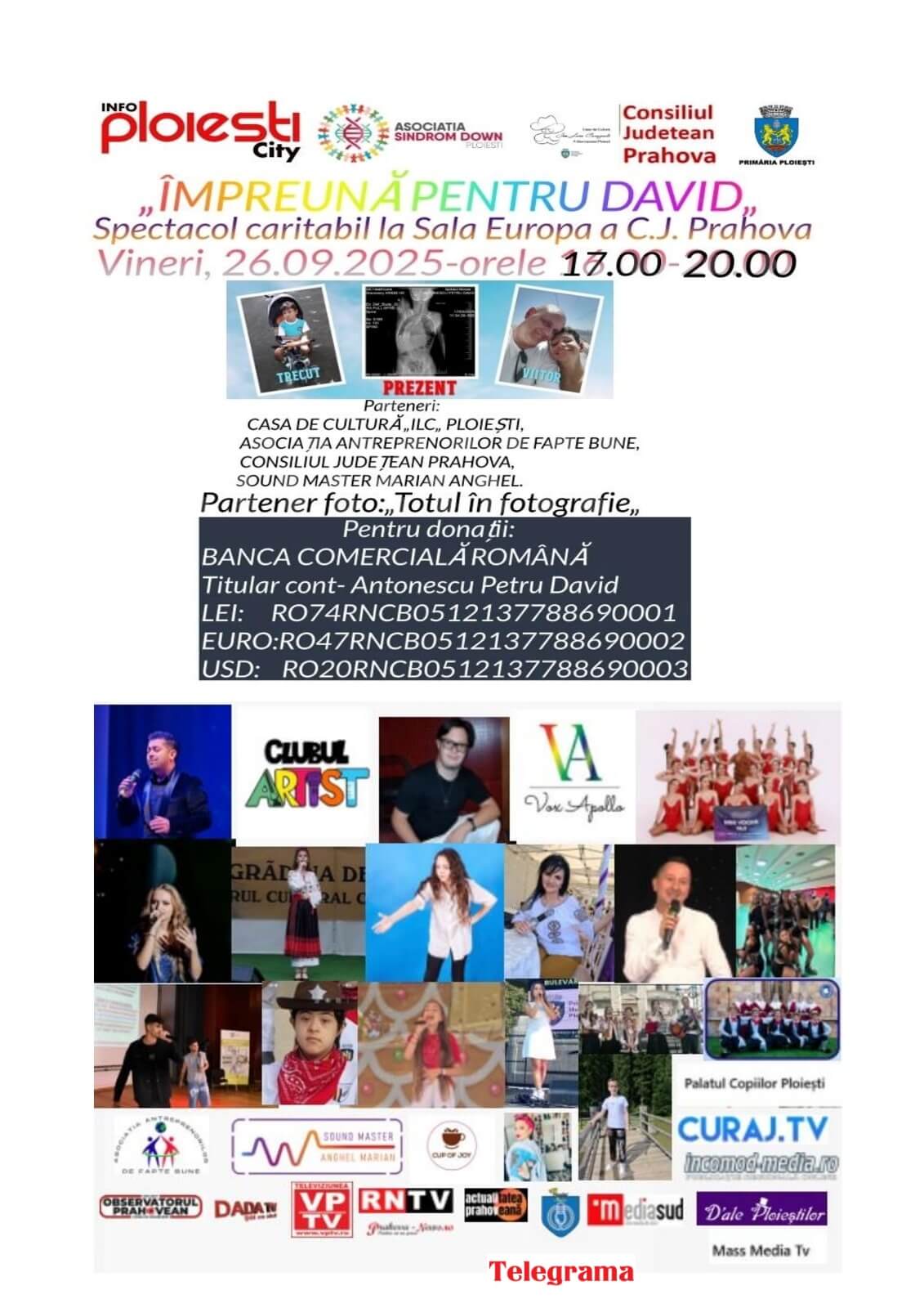 Vineri, 26 septembrie 2025, între orele 17.00-20.00, publicația on line INFO PLOIEȘTI CITY și ASOCIAȚIA SINDROM DOWN PLOIEȘTI în colaborare cu CASA DE CULTURĂ „I.L. CARAGIALE PLOIEȘTI, vor organiza, la SALA EUROPA A CJ PRAHOVA, SPECTACOLUL UMANITAR „ÎMPREUNĂ PENTRU DAVID„.