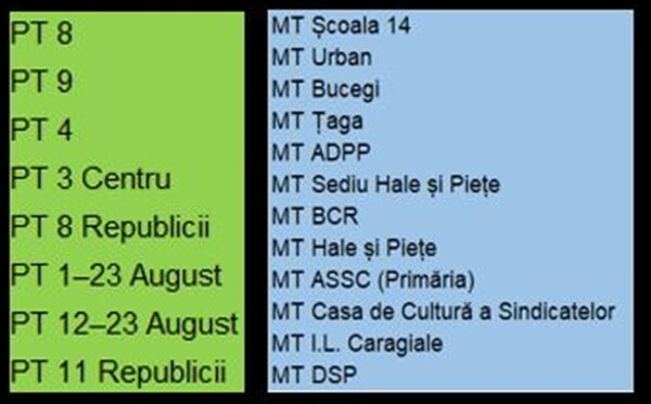 „În vederea remedierii unei avarii pe magistrala IV Centru, în zona 7 Etaje – Palatul Culturii, în data de 25.11.2025, în intervalul orar 08:00 – 21:30, se va întrerupe furnizarea ACC/ACI pentru consumatorii racordați la următoarele punctele termice și module termice:
