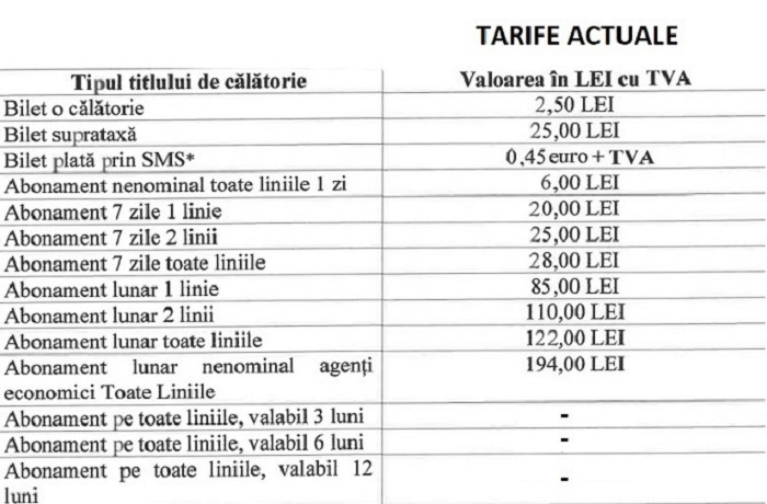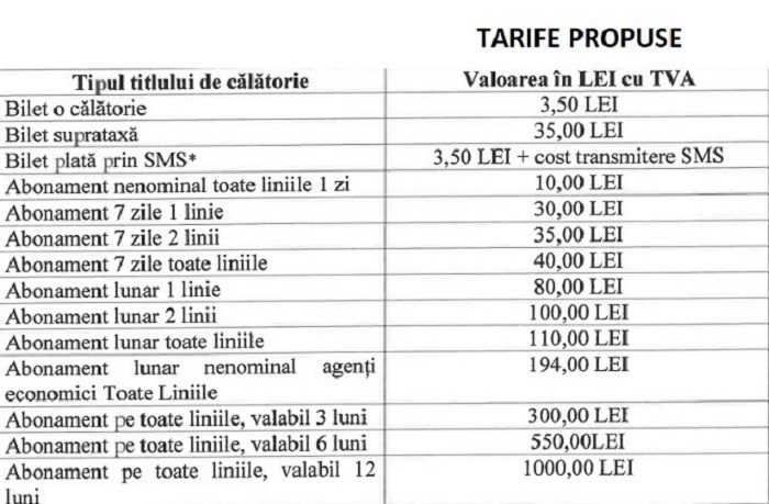 Conform propunerii, prețul unui bilet ar urma să fie majorat cu 1 leu (40% din tariful actual pentru o călătorie). Alte scumpiri vizează legitimațiile de o zi și abonamentele pe o săptămână, în timp ce prețul abonamentelor lunare ar urma să scadă.